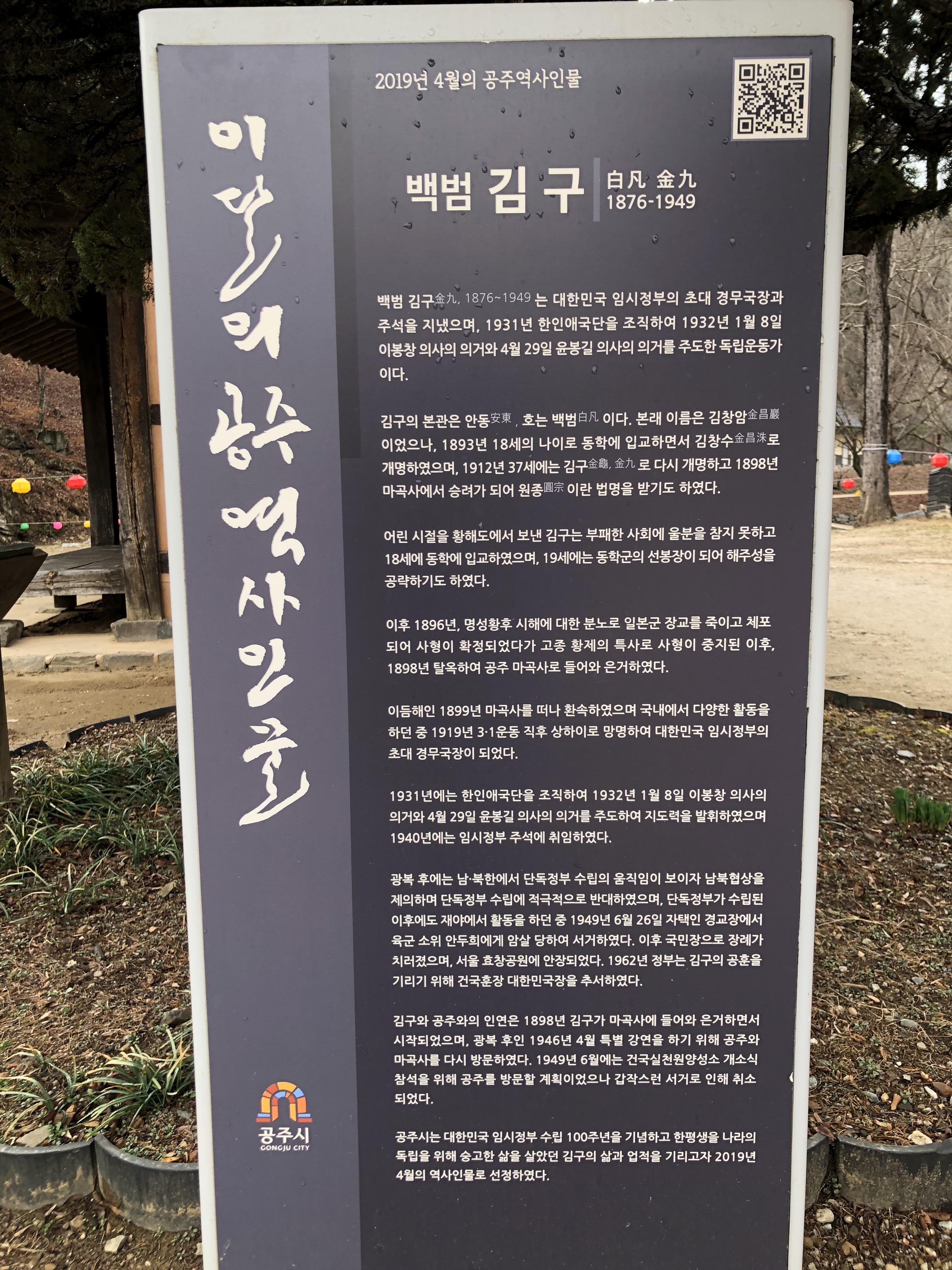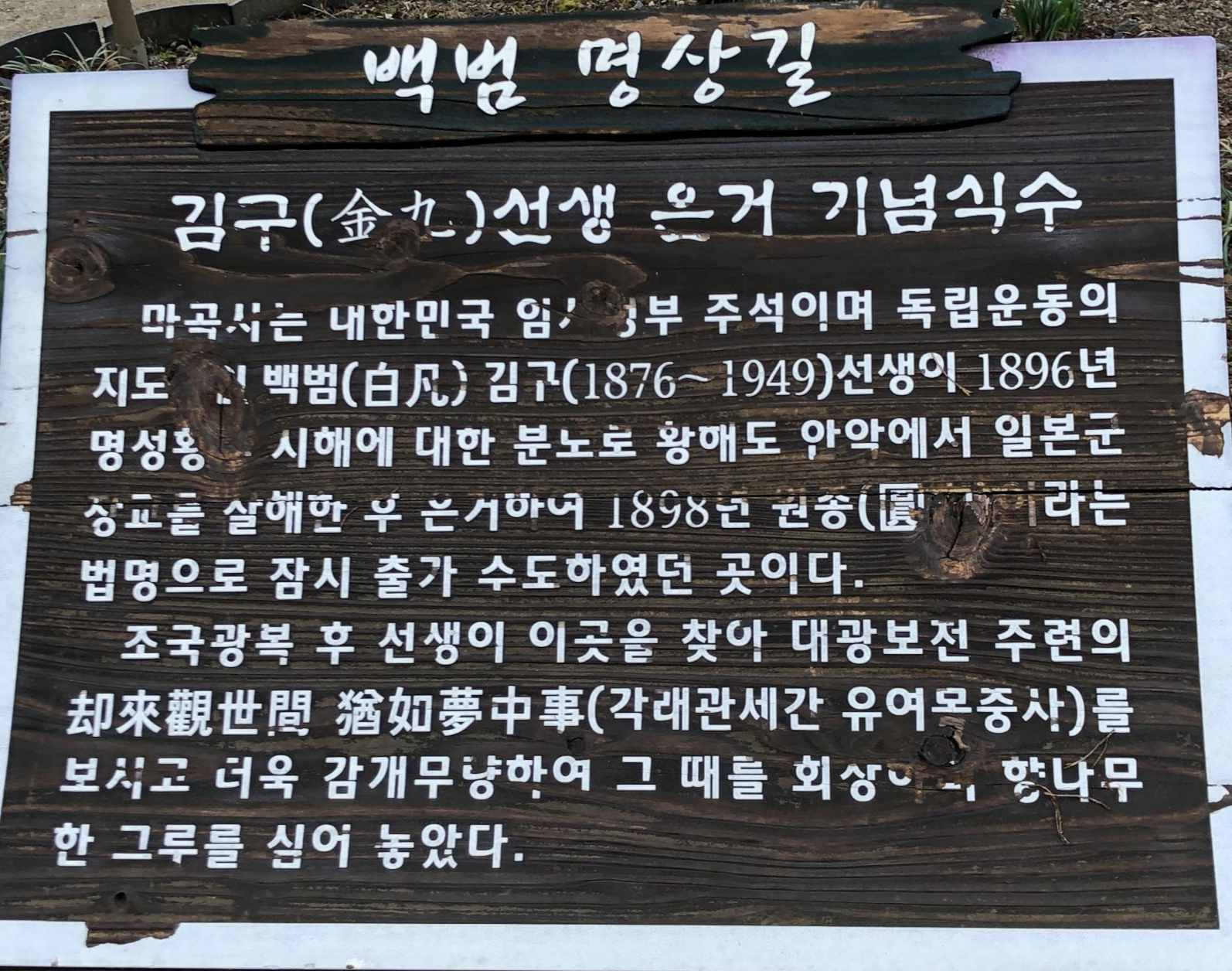 명성황후 시해로 대단히 분노하신 김구 선생은 황해도 안악군 치하포나루에서 일본군 장교를 죽이고 인천형무소에서 옥살이하다가 탈옥하여 마곡사에서 은거할 때 잠시 출가하여 원종이라는 법명으로 수도하셨던 곳이다.