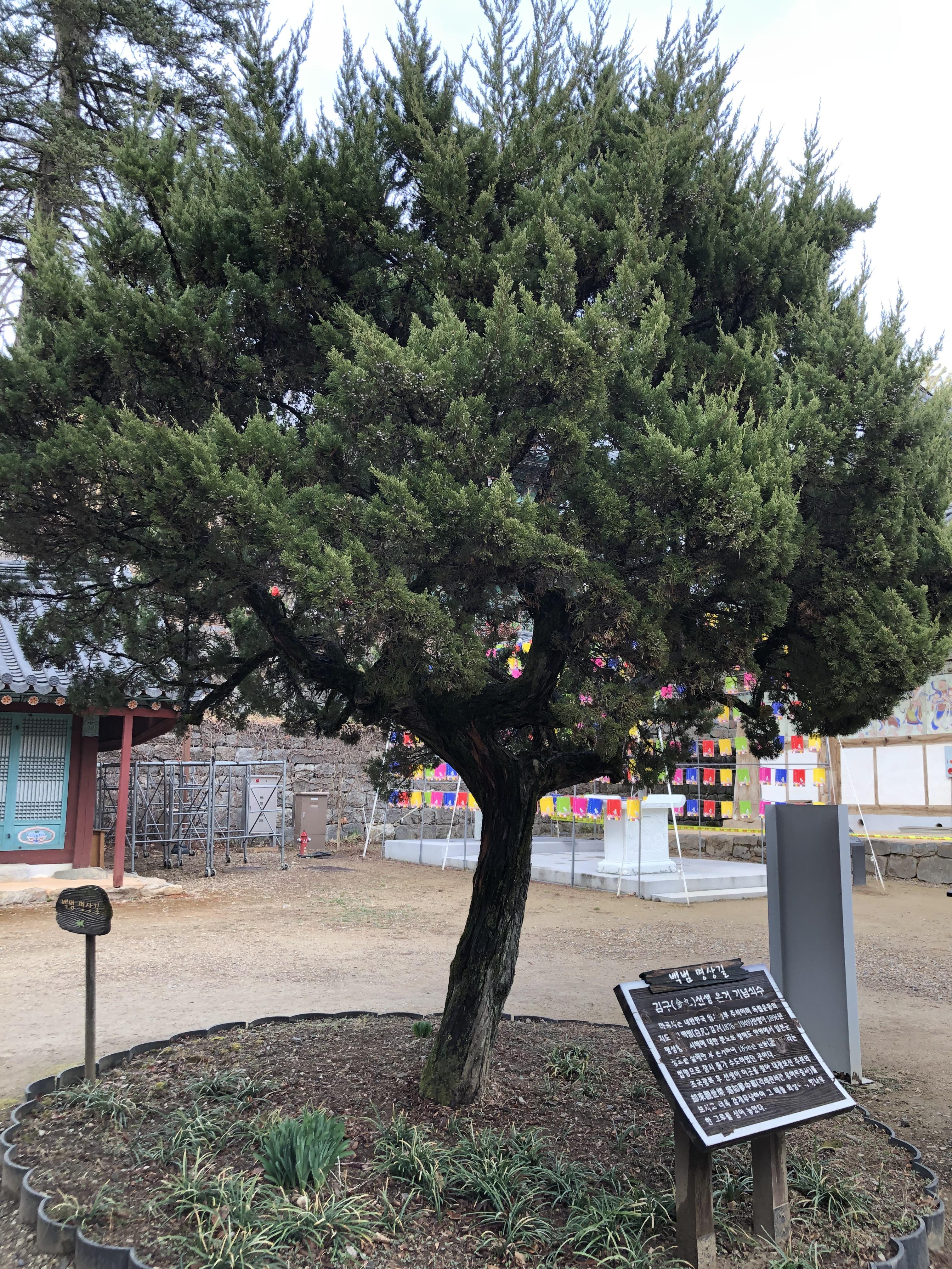 백범 김구선생은 1898년 마곡사를 떠난 후, 근 50년 만에 돌아와 대광보전 기둥에 걸려있는 주련의 (각래관세간 유여몽중사 : 돌아와 세상을 보니 마치 꿈 가운데 일 같구나)라는 능엄경에 나오는 문구를 보고 감개무량하여 그때를 생각하며 한그루의 향나무를 심어 놓았는데, 지금도 백범당 옆에 푸르게 자리하고 있다.