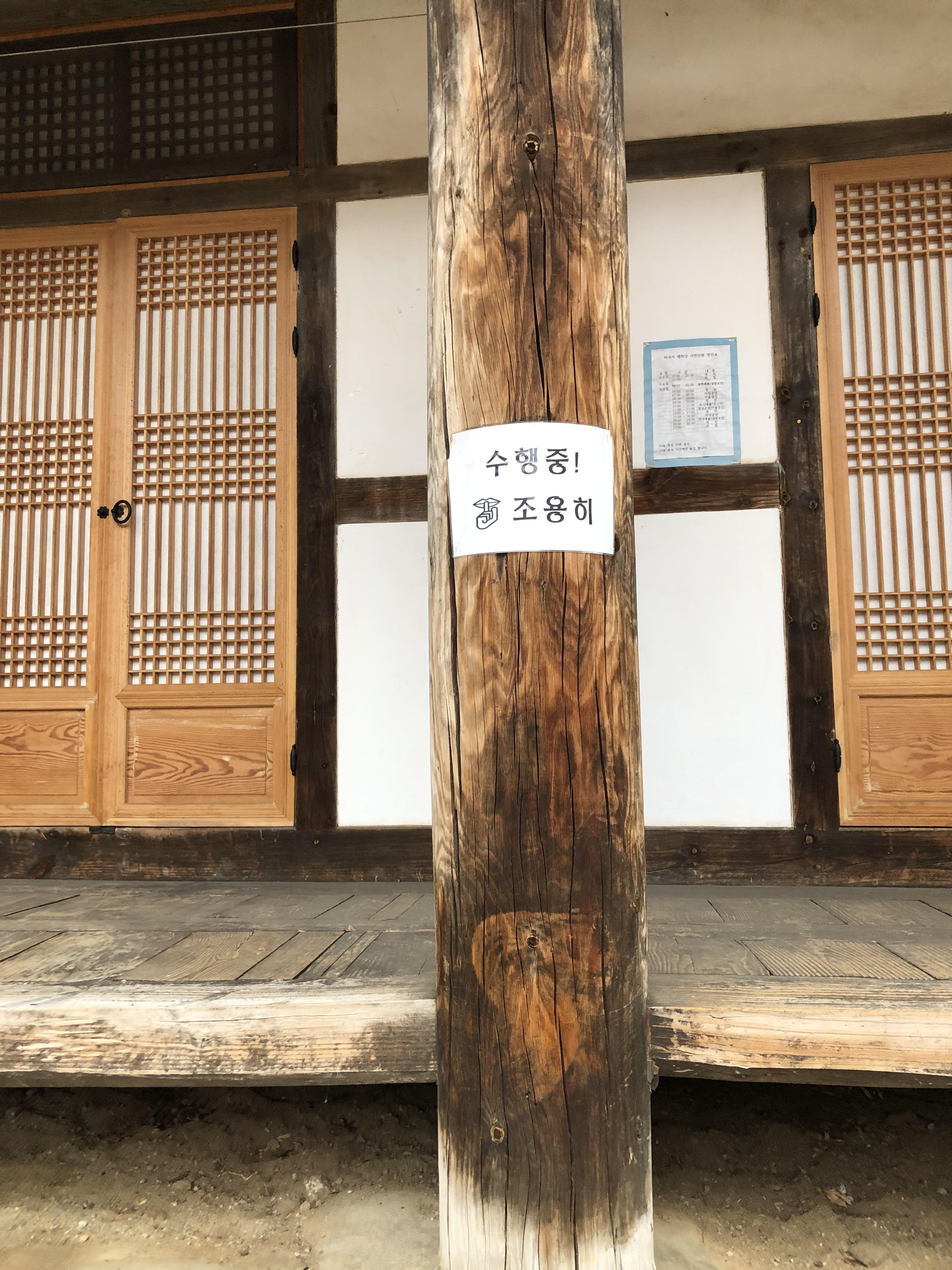 기둥에 붙은 수행 중이니 조용히 해주시라는 주의문구가 붙어있다.