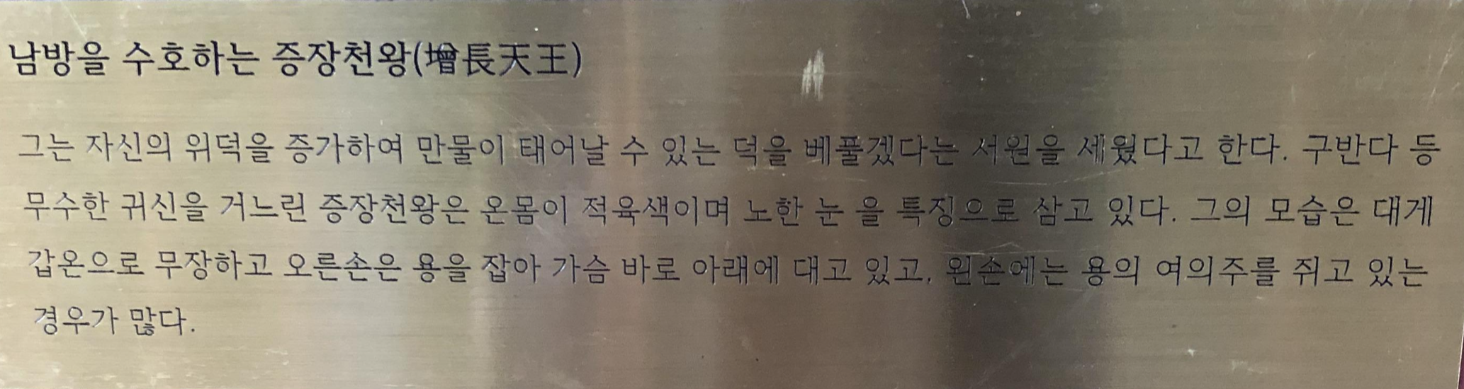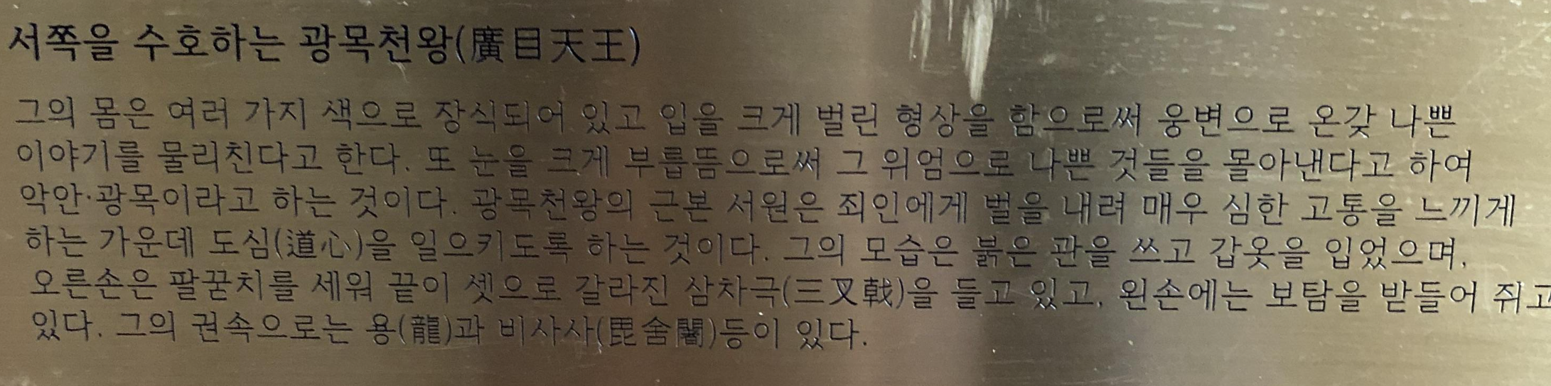 보탑을 들고 있는 천왕님은 다문천왕으로 알고 있으며 이곳의 설명을 보면 이해가 되지 않는 부분이 있다.