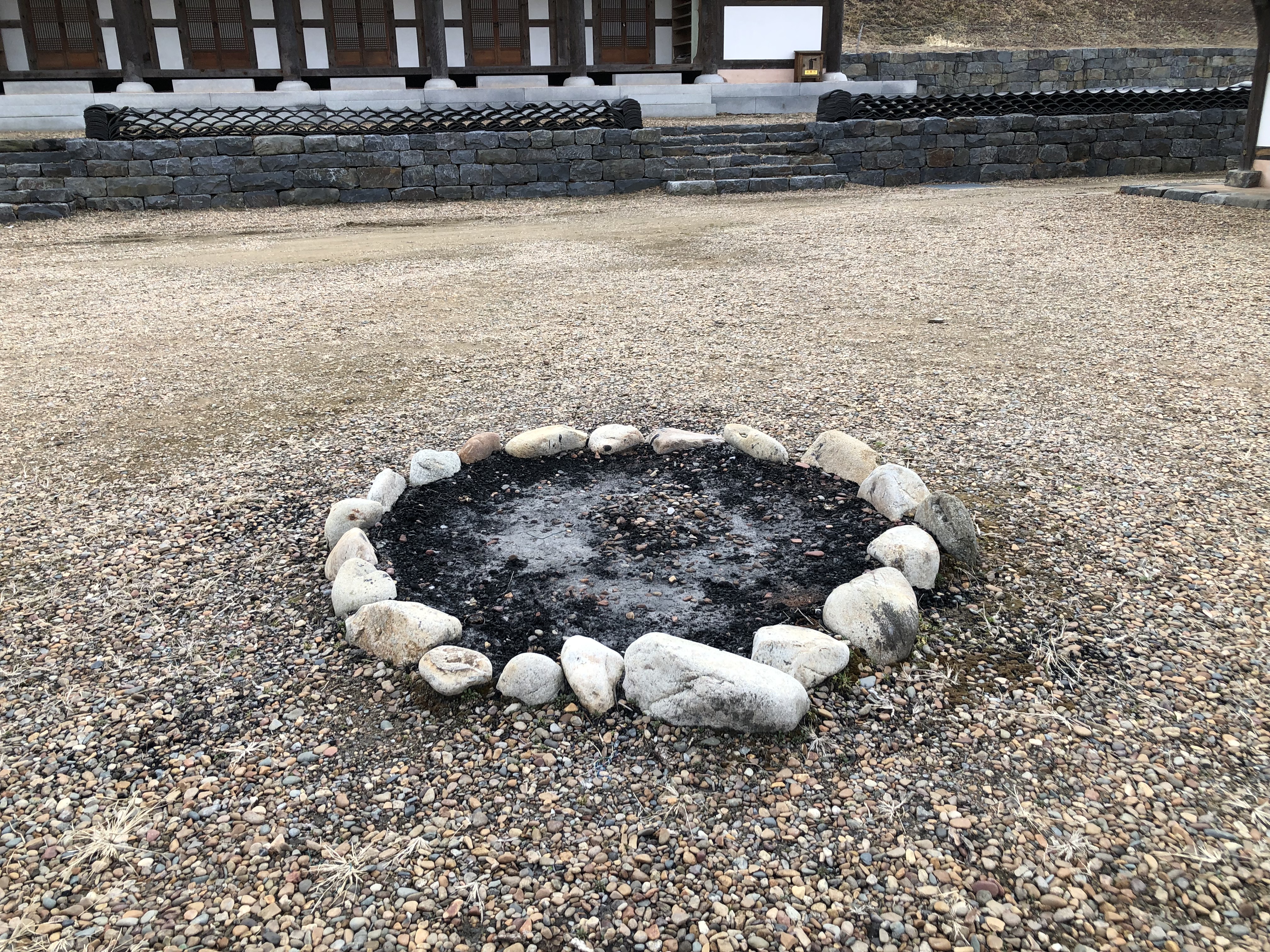 마당의 한 가운데에 캠프파이어의 흔적이 있다.
