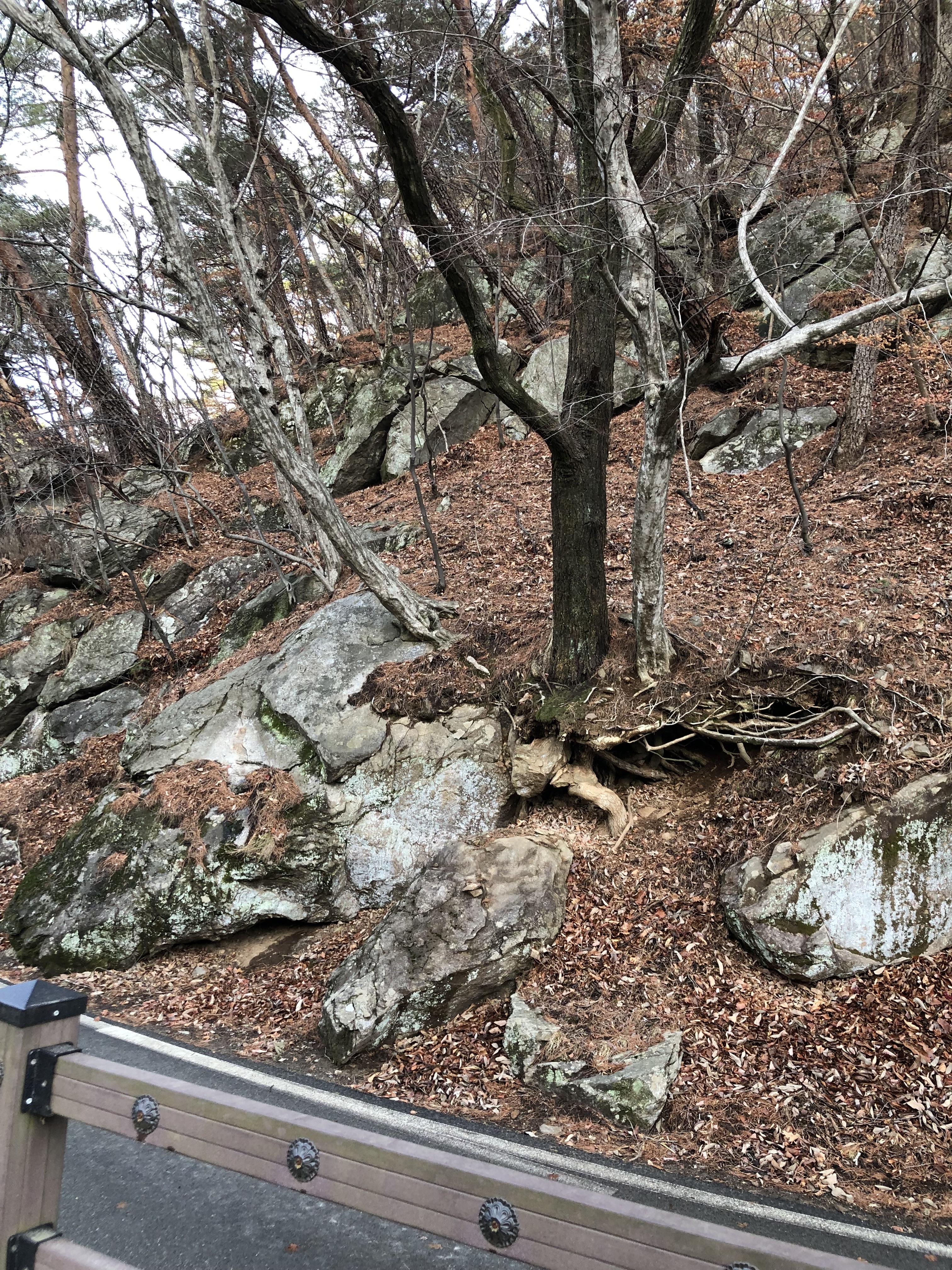 저 멀리 다리가 보이고 그 앞에 있는 돌에 약수가 있다.
