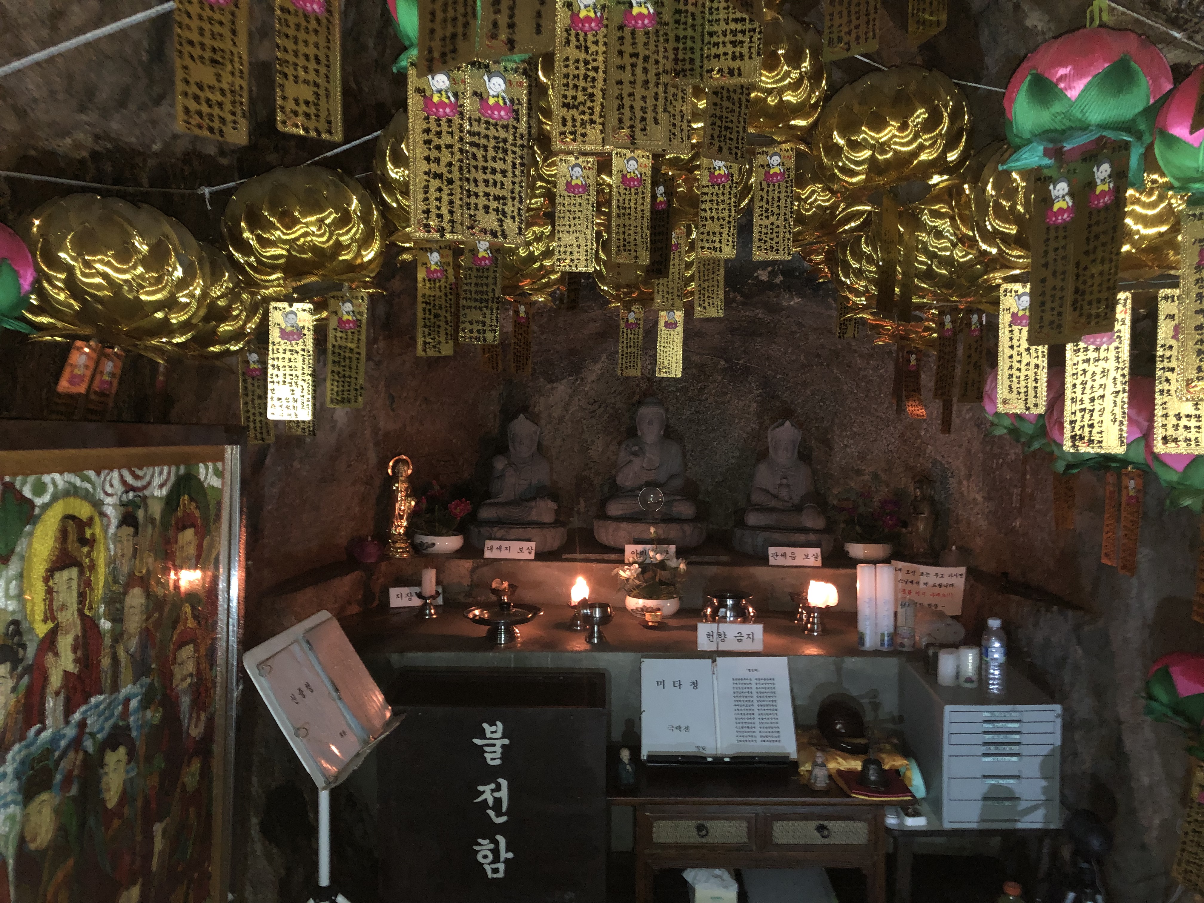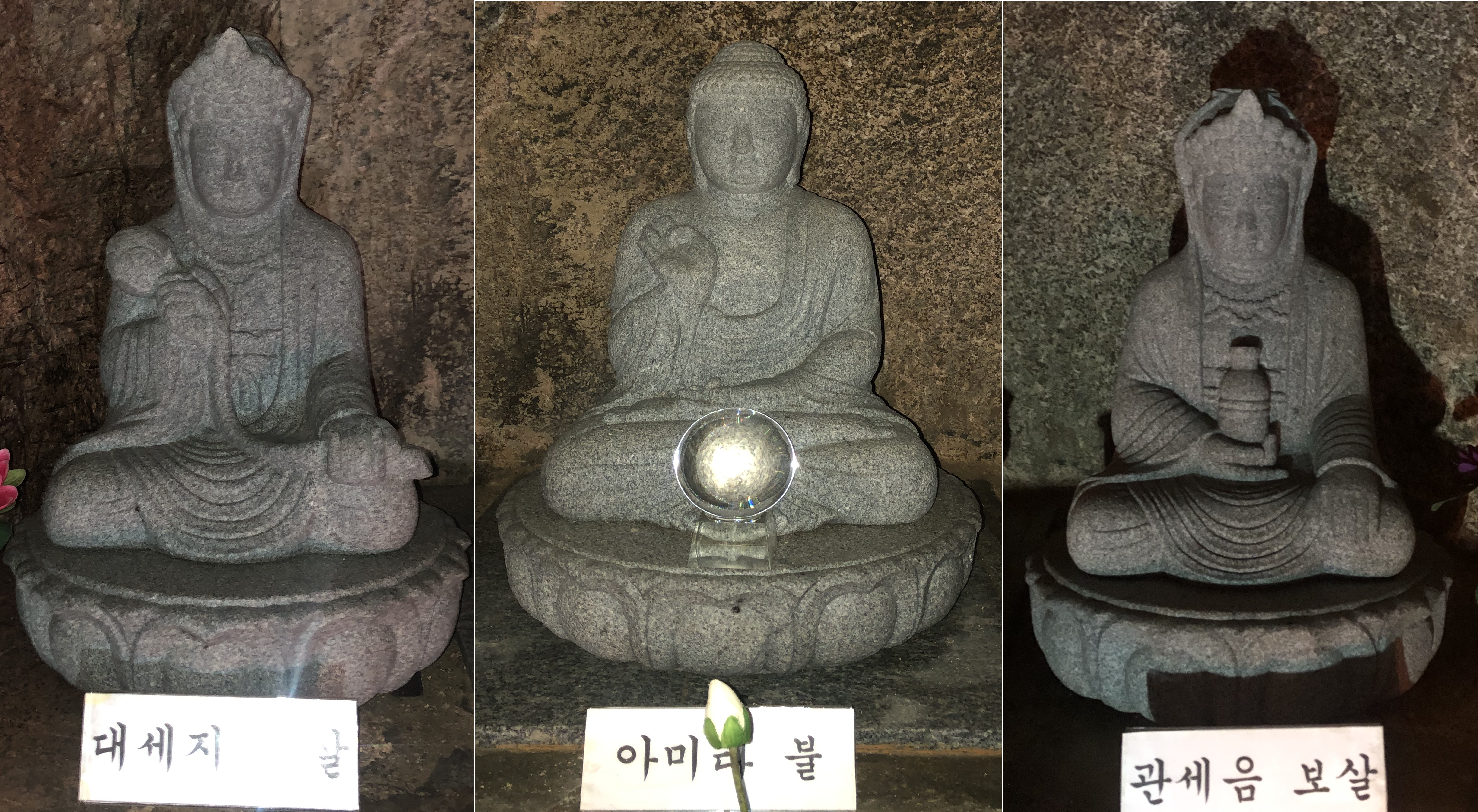 세분 부처님 석상으로 모셨고, 아미타부처님 앞에 수정구슬인지 뭔지 모를 물체가 빛을 뿜고 있다.