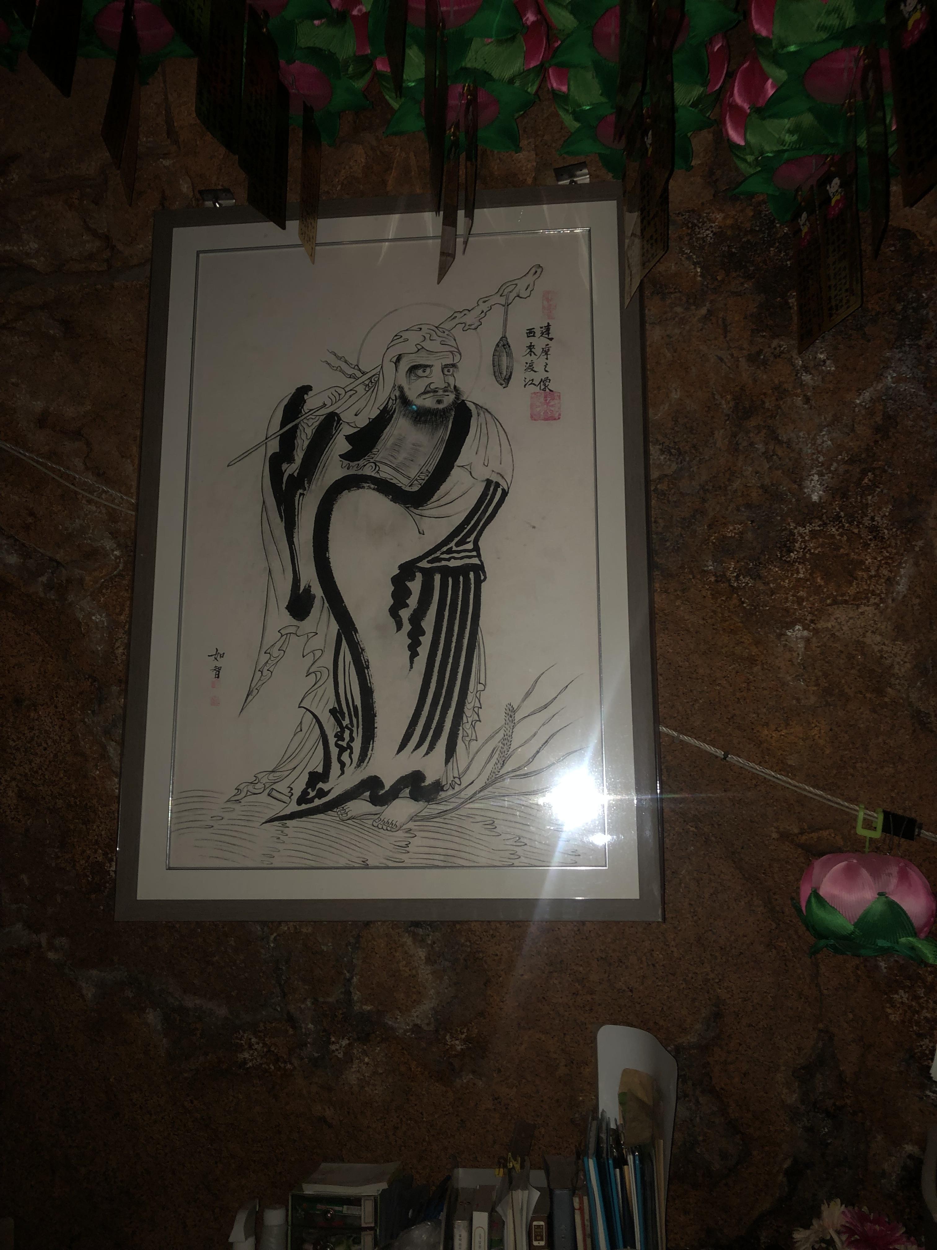 암벽의 한편에 달마대사의 그림이 걸려있다.