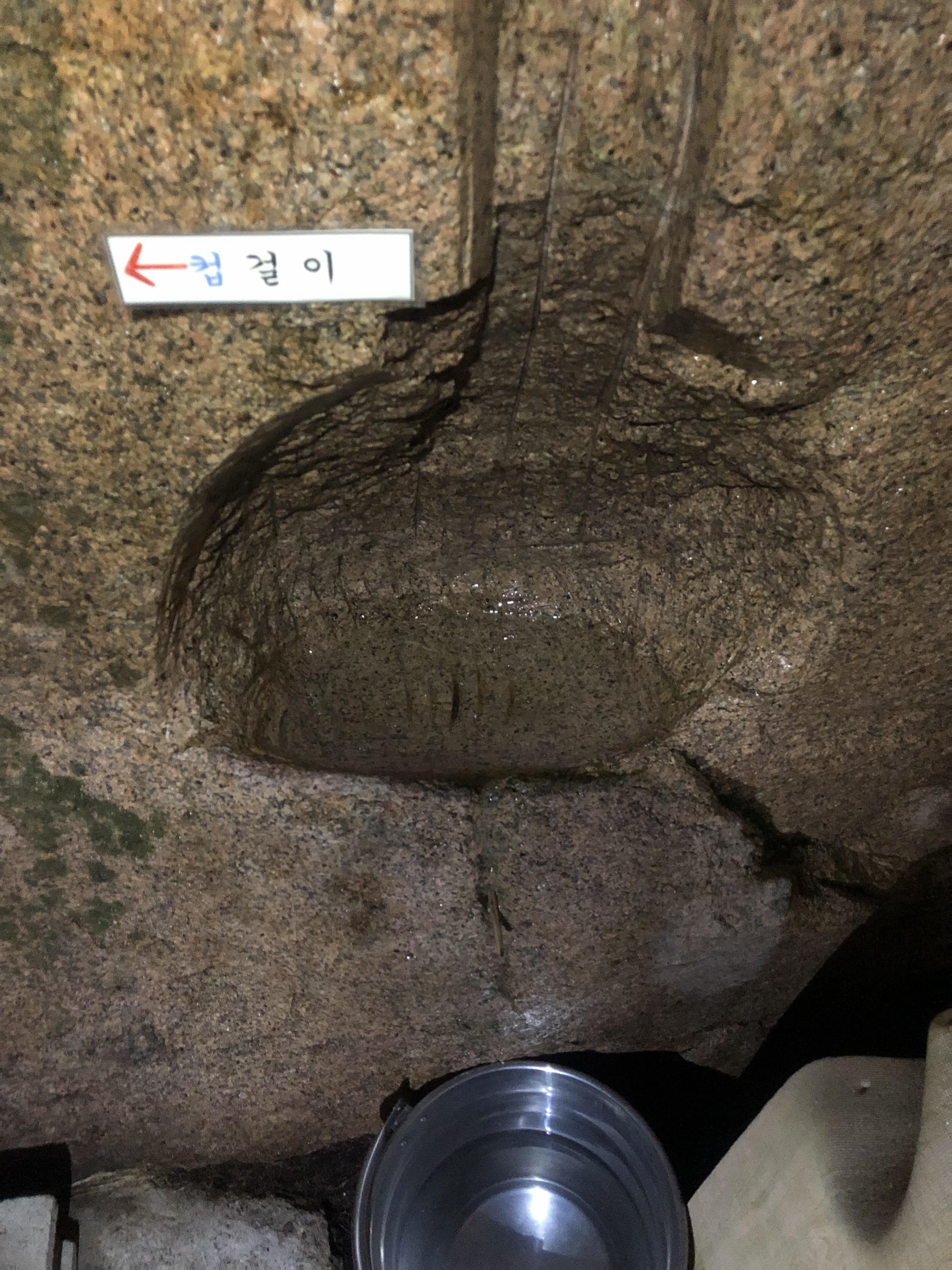 암벽에서 솟아나와 벽을 타고 내려오는 물을 돌을 파서 돌웅덩이에 모이도록 했다.