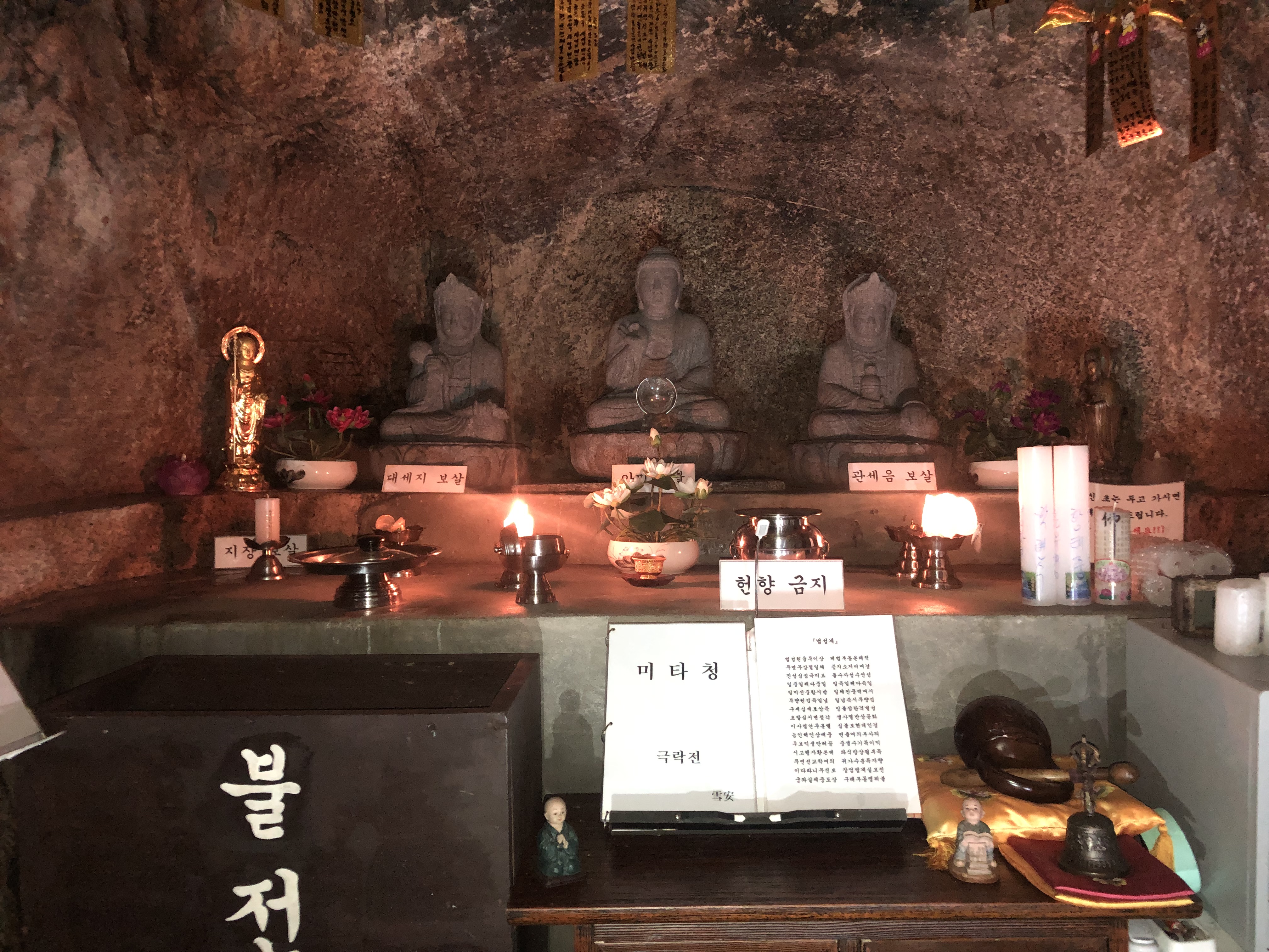세분 부처님 석상으로 모셨고, 아미타부처님 앞에 수정구슬인지 뭔지 모를 물체가 빛을 뿜고 있다.