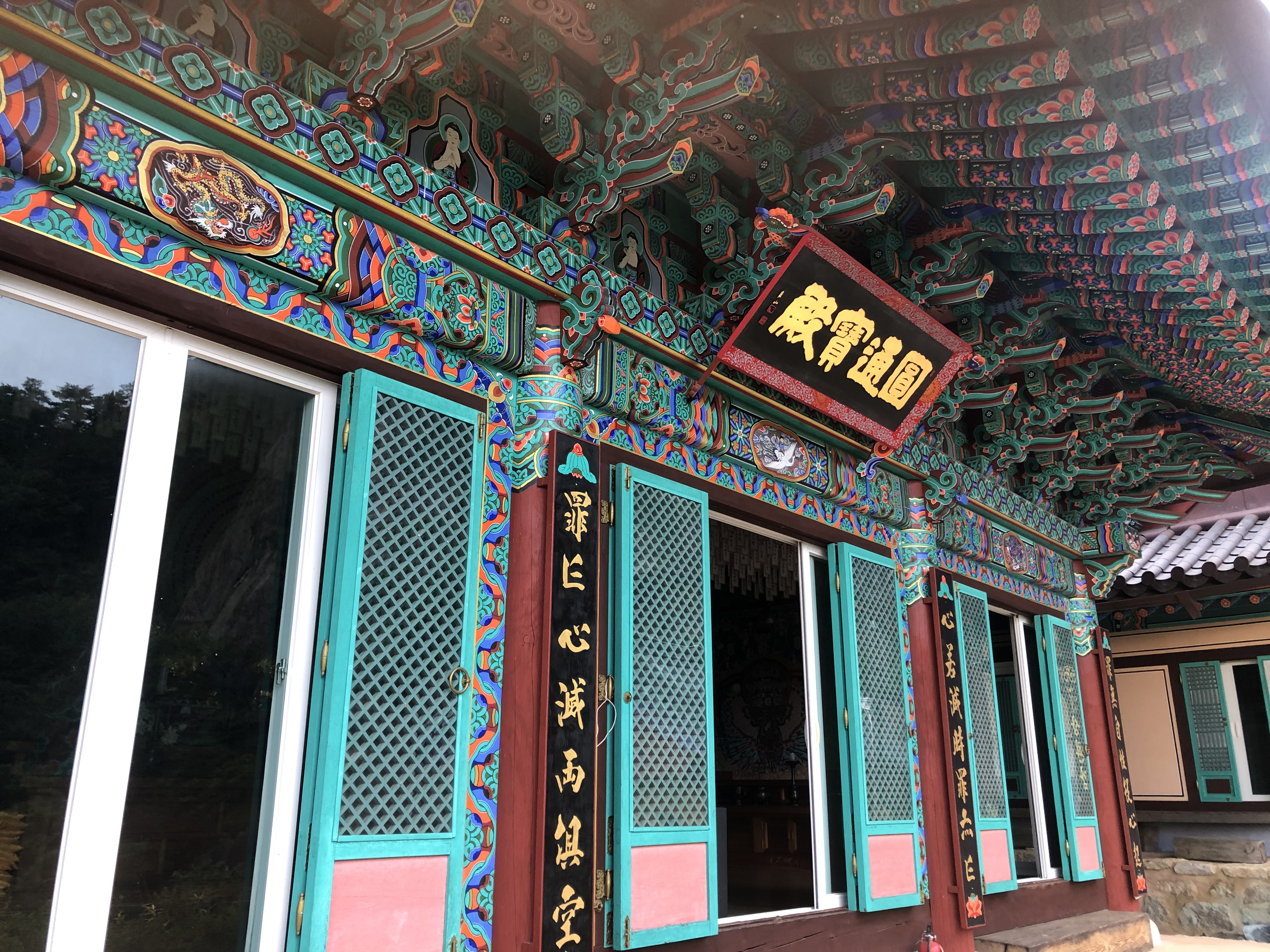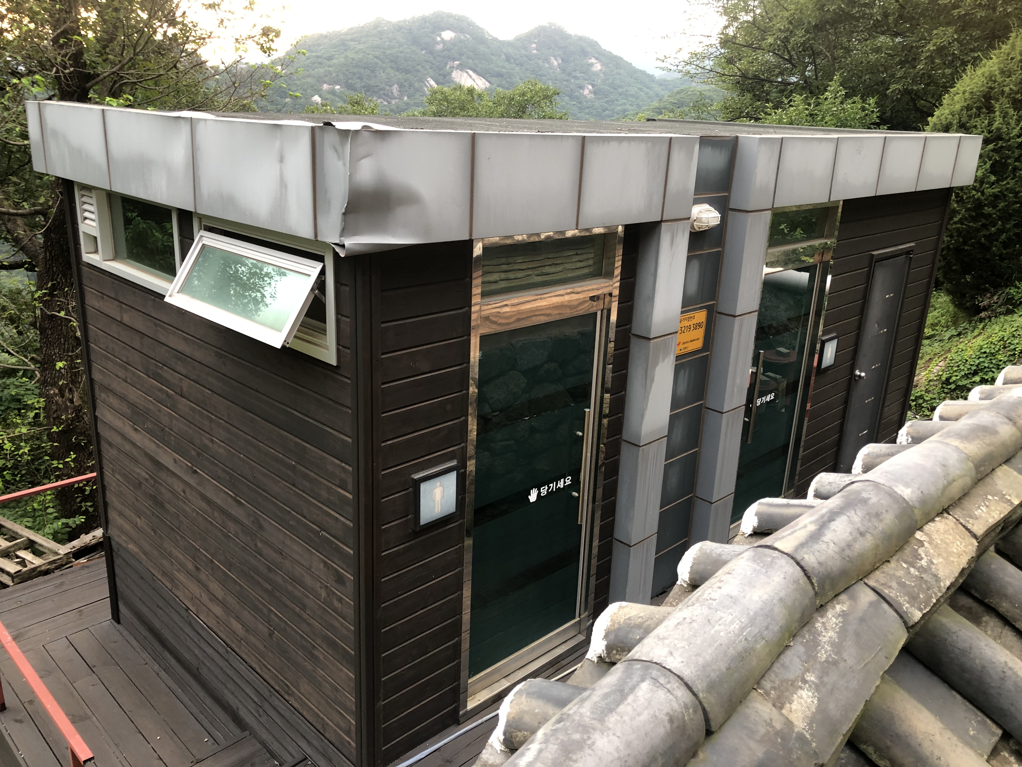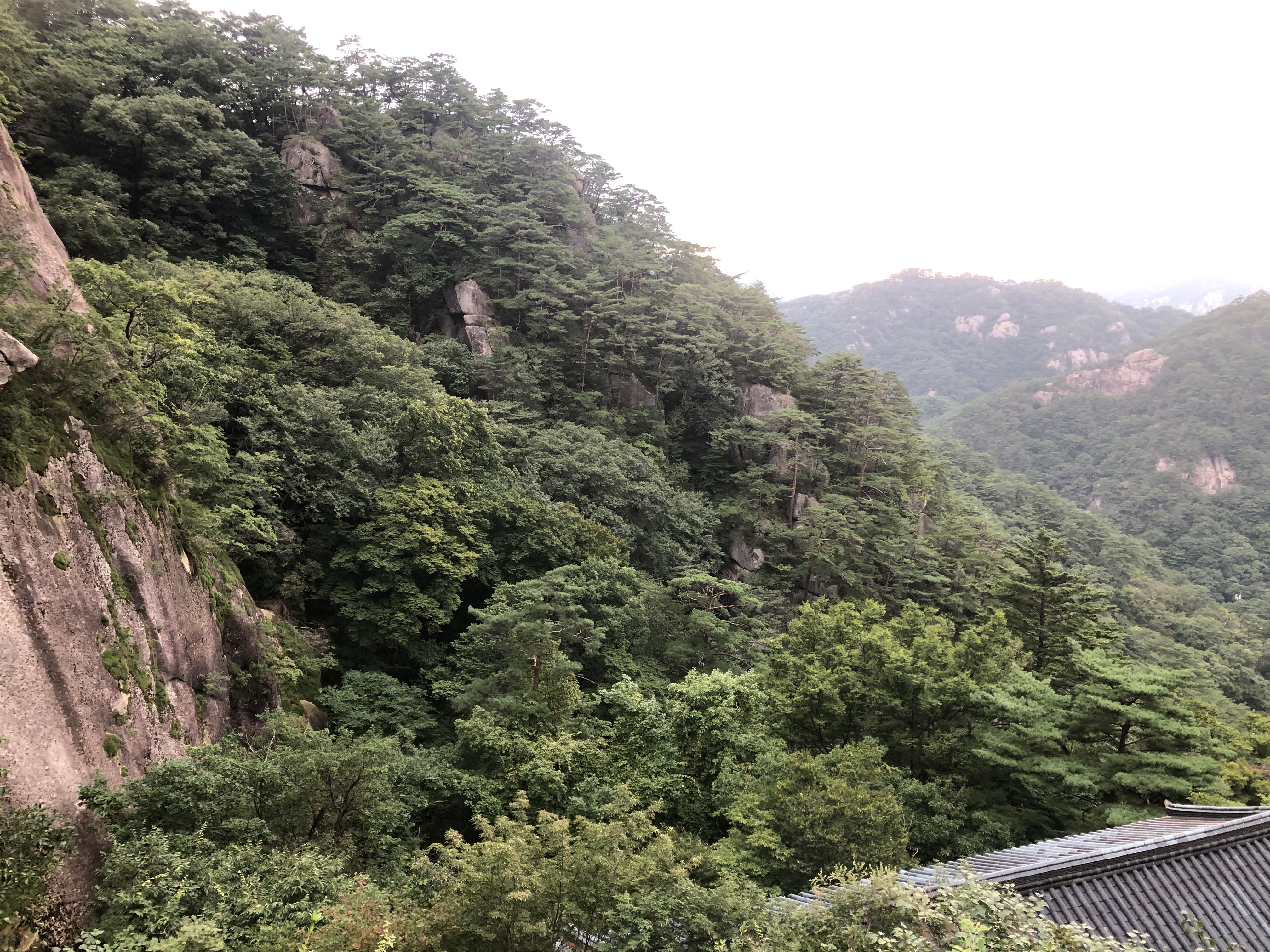 오른쪽 아래가 화장실이고, 정면 건물이 원통보전, 좌측 상단에 살짝 보이는 바위 위에 있는 전각이 산신각이다.