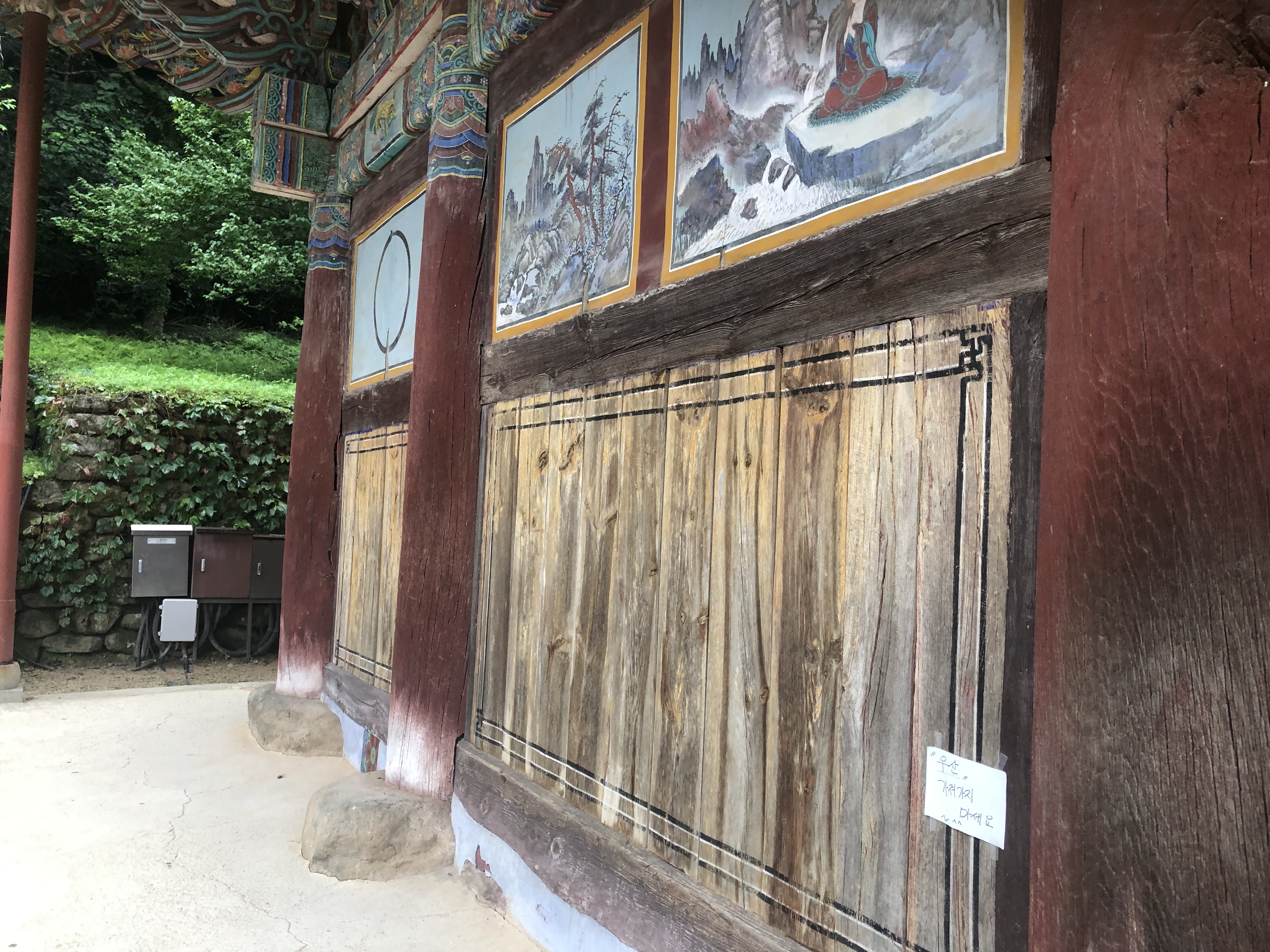 처음해우소다. 천왕문 옆에 있다.해우소 해우소를 지나치면 아래로 내려가는 길이 있는데 출입금지 표시가 있으니 출입이 금지되어 있다. 내리막길 옆으로는 어느 마당이 보이는데 역