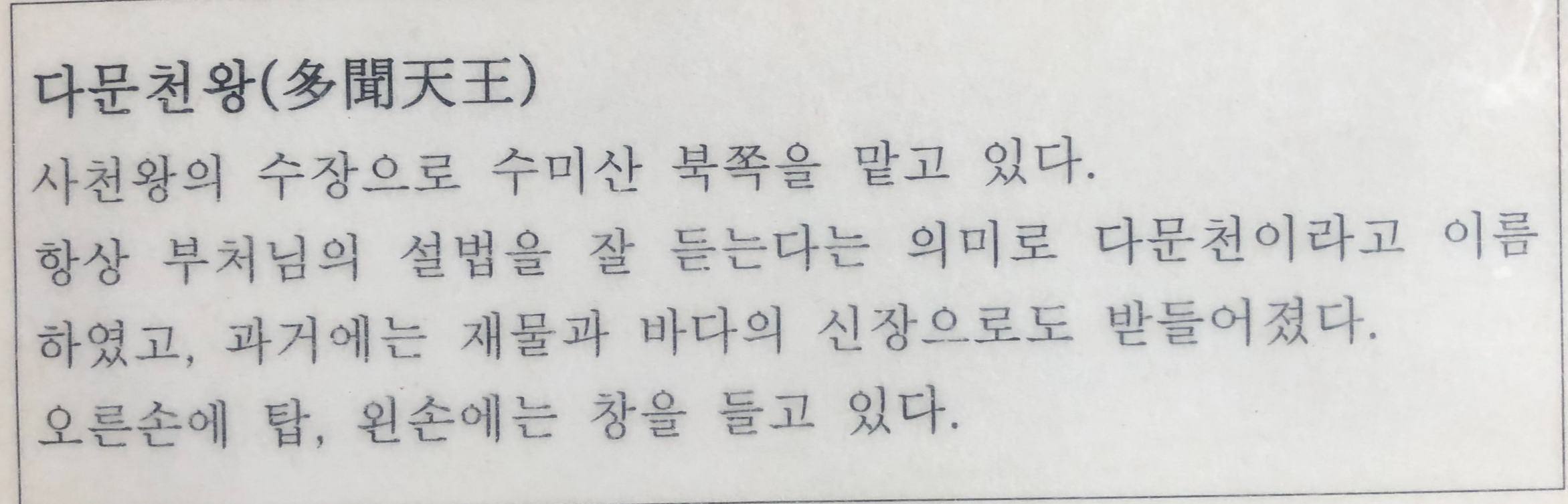 사천왕의 수장으로 수미산 북쪽을 맡고 있다.