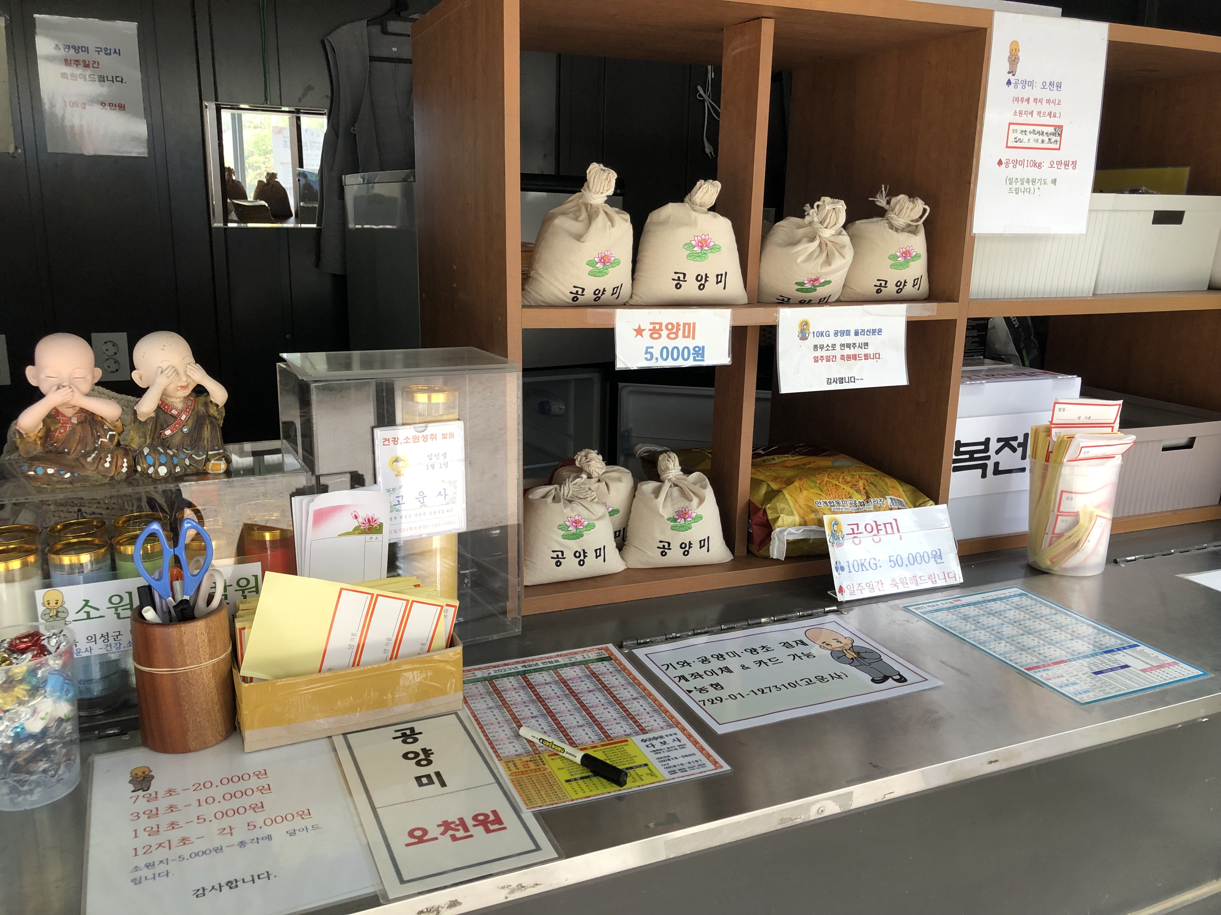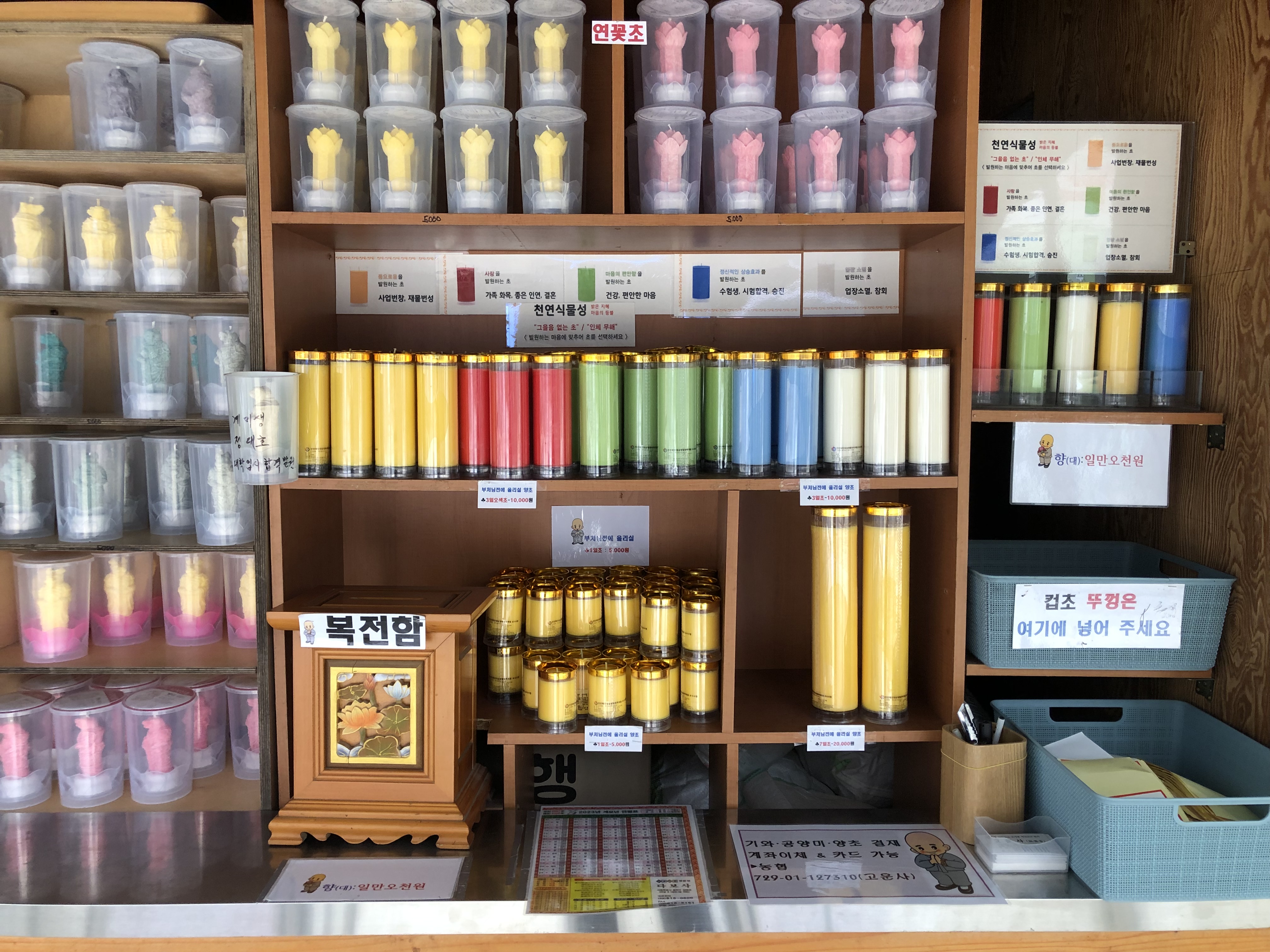 왼쪽 판매대에는 초와 향을 판다면 오른쪽 판매대에는 공양미를 팔고 있다.