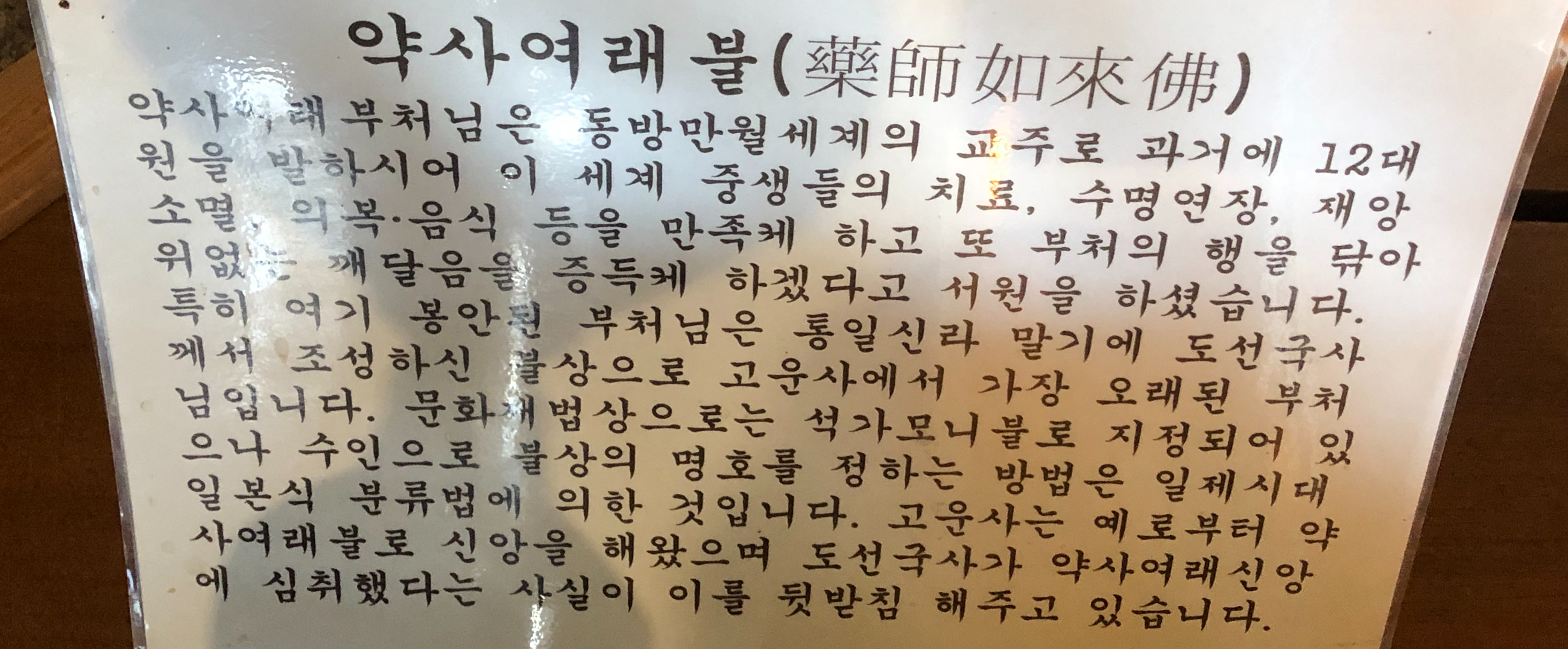 부처님의 앞에 있는 명패가 틀림없는 약사여래불임을 확인시켜 준다.