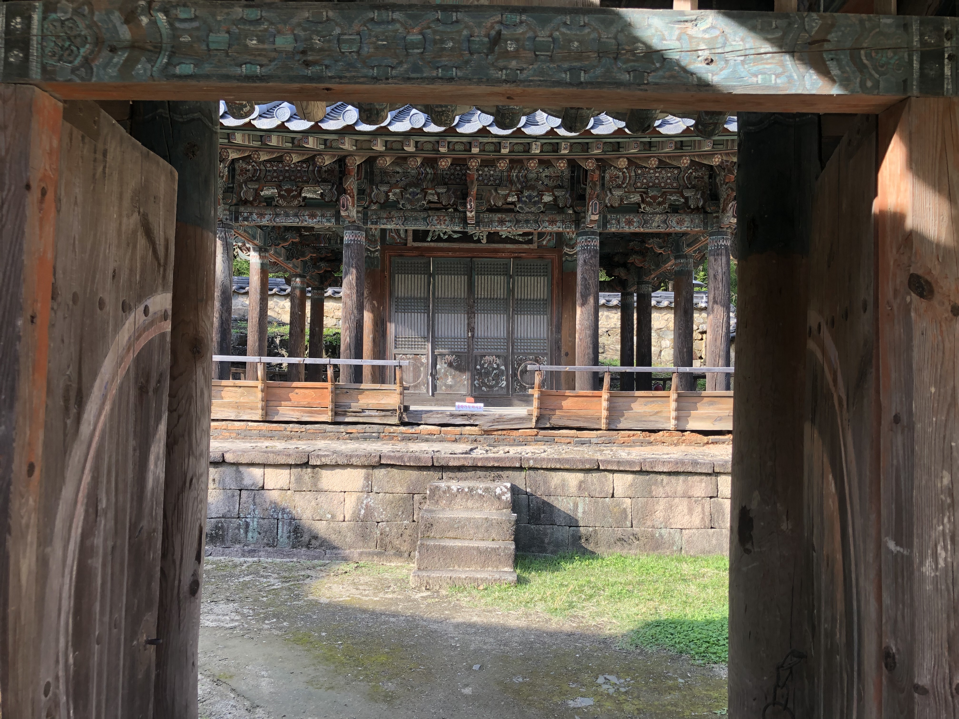 문 앞에 마루가 있는 모습과 기단 위 디딤돌에 신발이 놓여 있는 모습을 보아 안에 사람이 있는 모양이다.