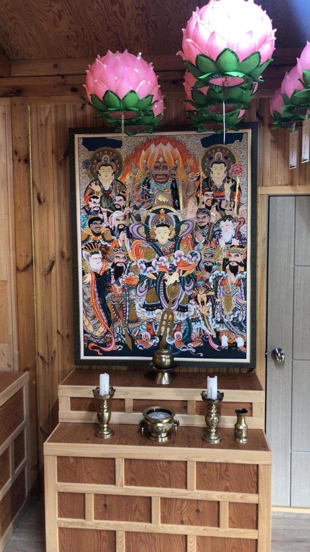 법당 정면에는 약사여래부처님과 지장보살님, 관세음보살님이 계시고, 오른쪽 벽면에 신장님들의 탱화가 걸려 있었다.