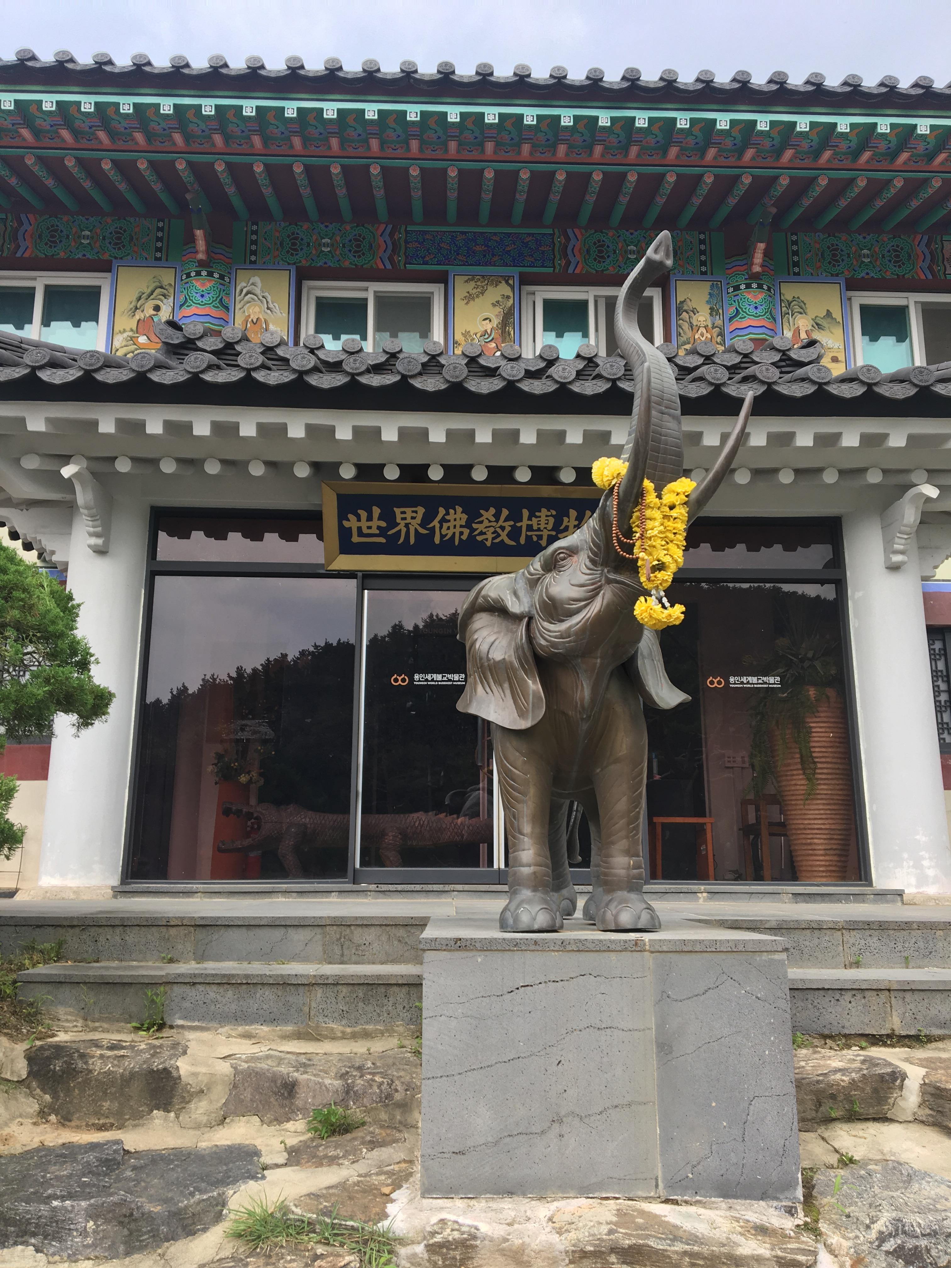 조각상 뒤 오른쪽에 보이는 건물은 용인세계불교박물관이다.