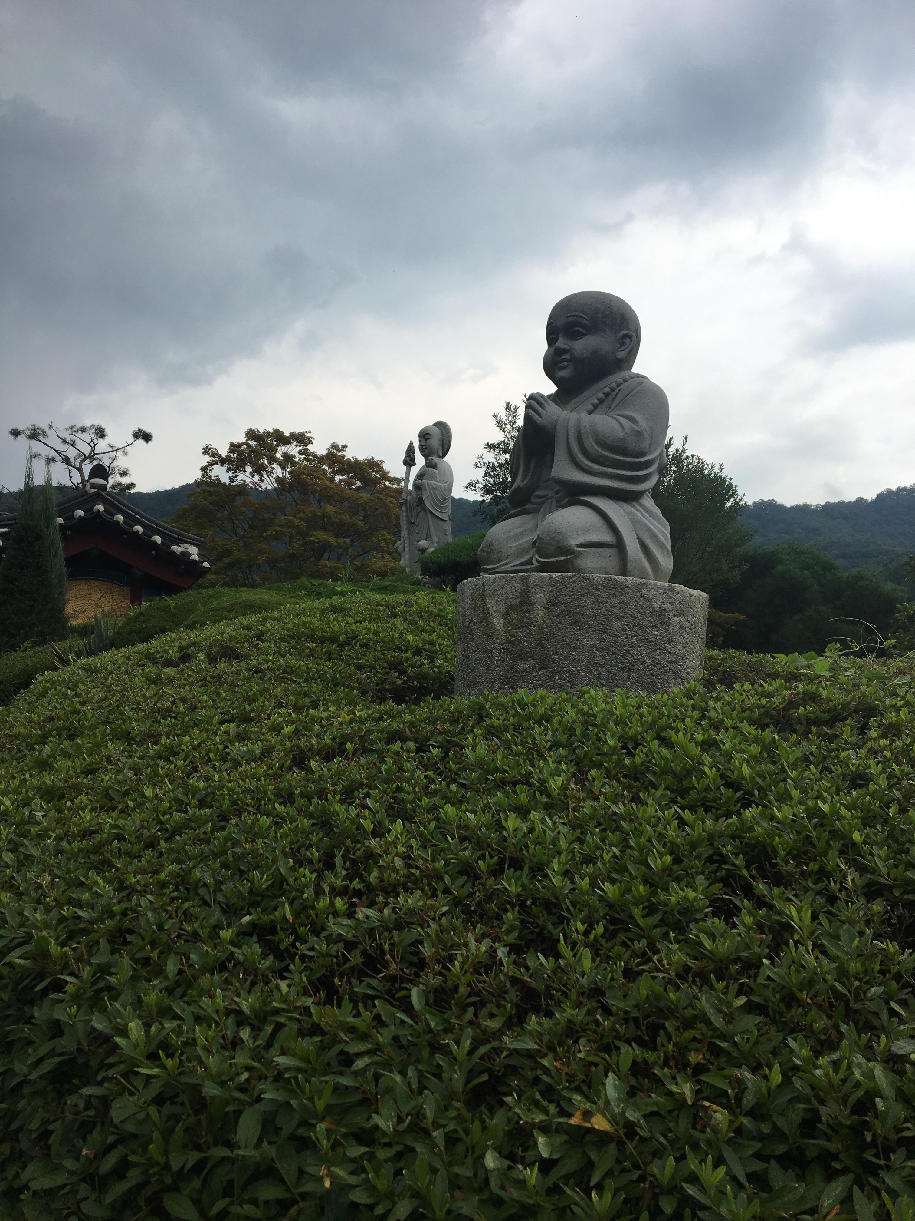 조각상 뒤 오른쪽에 보이는 건물은 용인세계불교박물관이다.