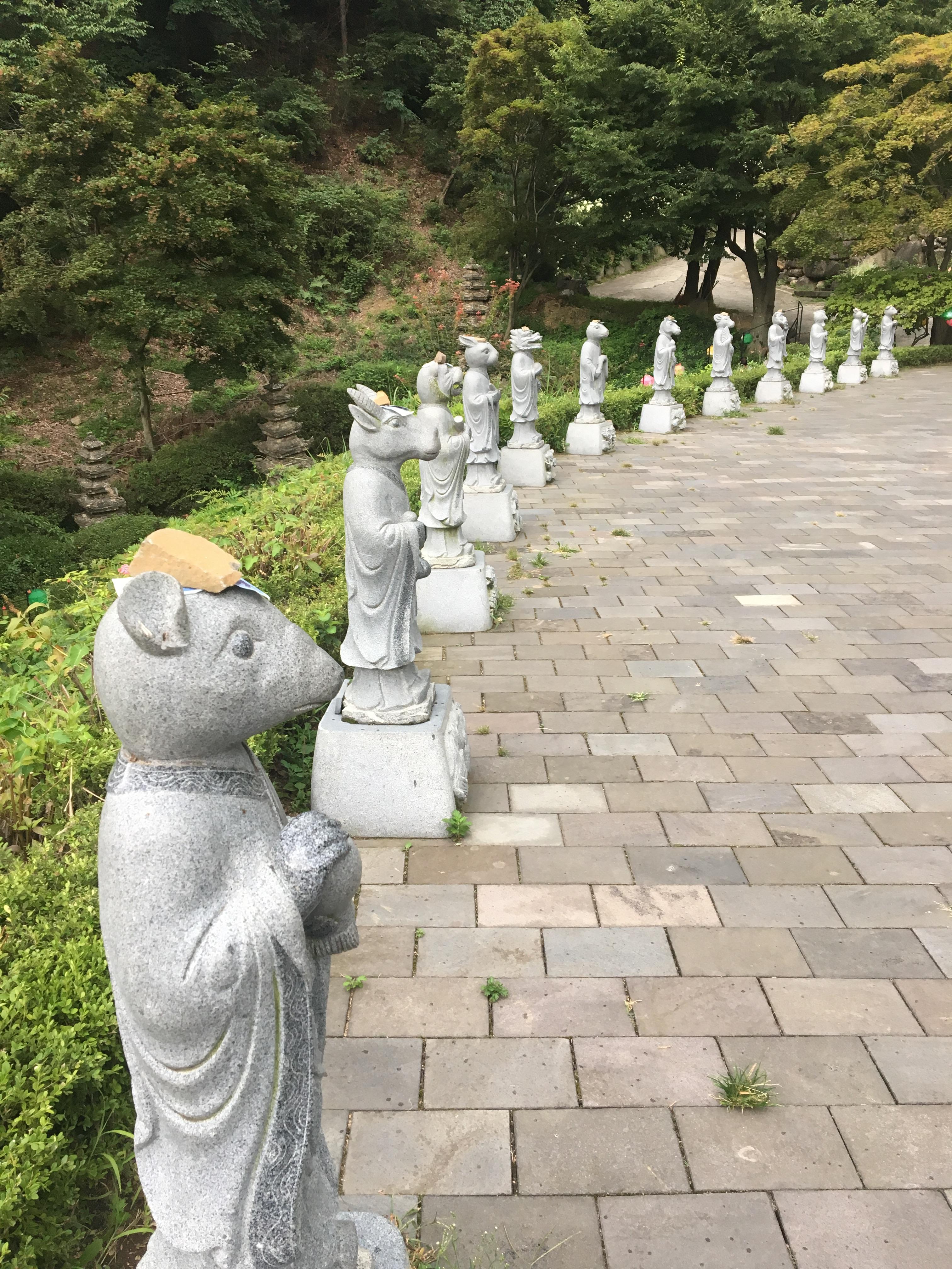 청동 미륵반가사유상대웅전을 나서고 보게 된 반가사유상이다.청동으로는 세계최대규모라고 한다. 12 지신12 지신 석상이다.청동미륵반가사유상과 마주 보며 있다.각기 12 지신의 머리 위에
