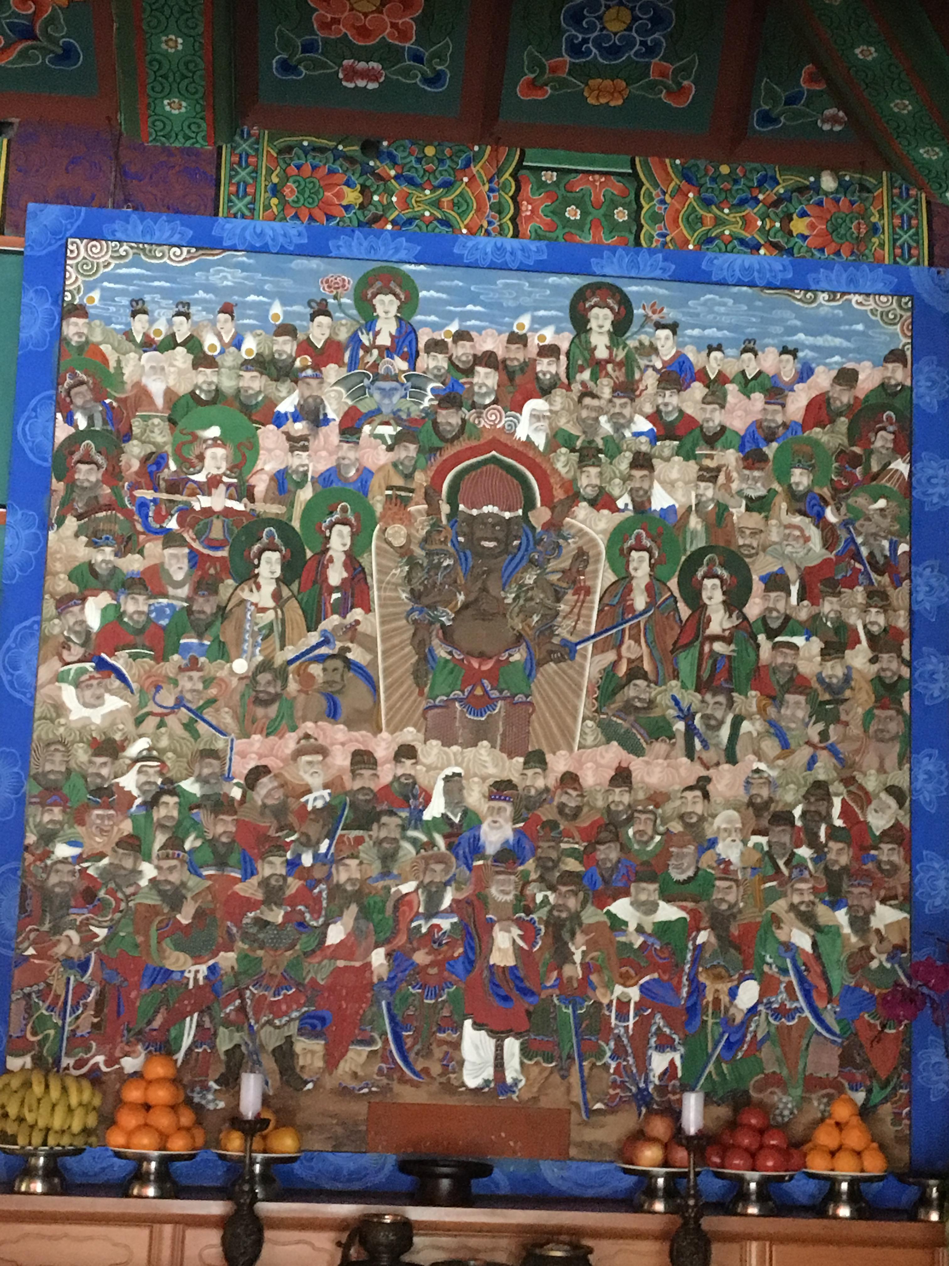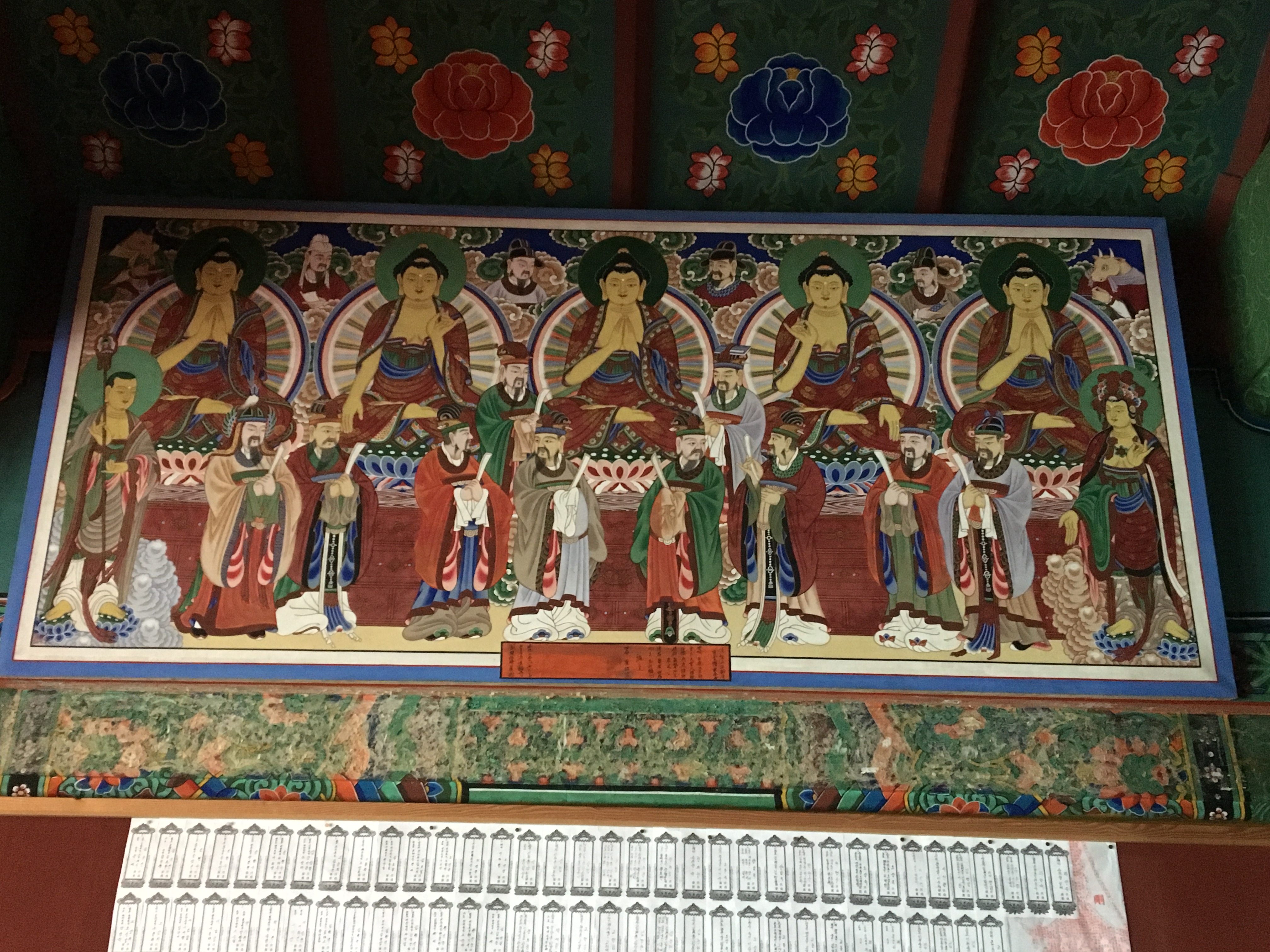 다섯분의 부처님 그림과 함께 지장보살님과 시왕님들로 보이는 분들이 있는 모습이다.