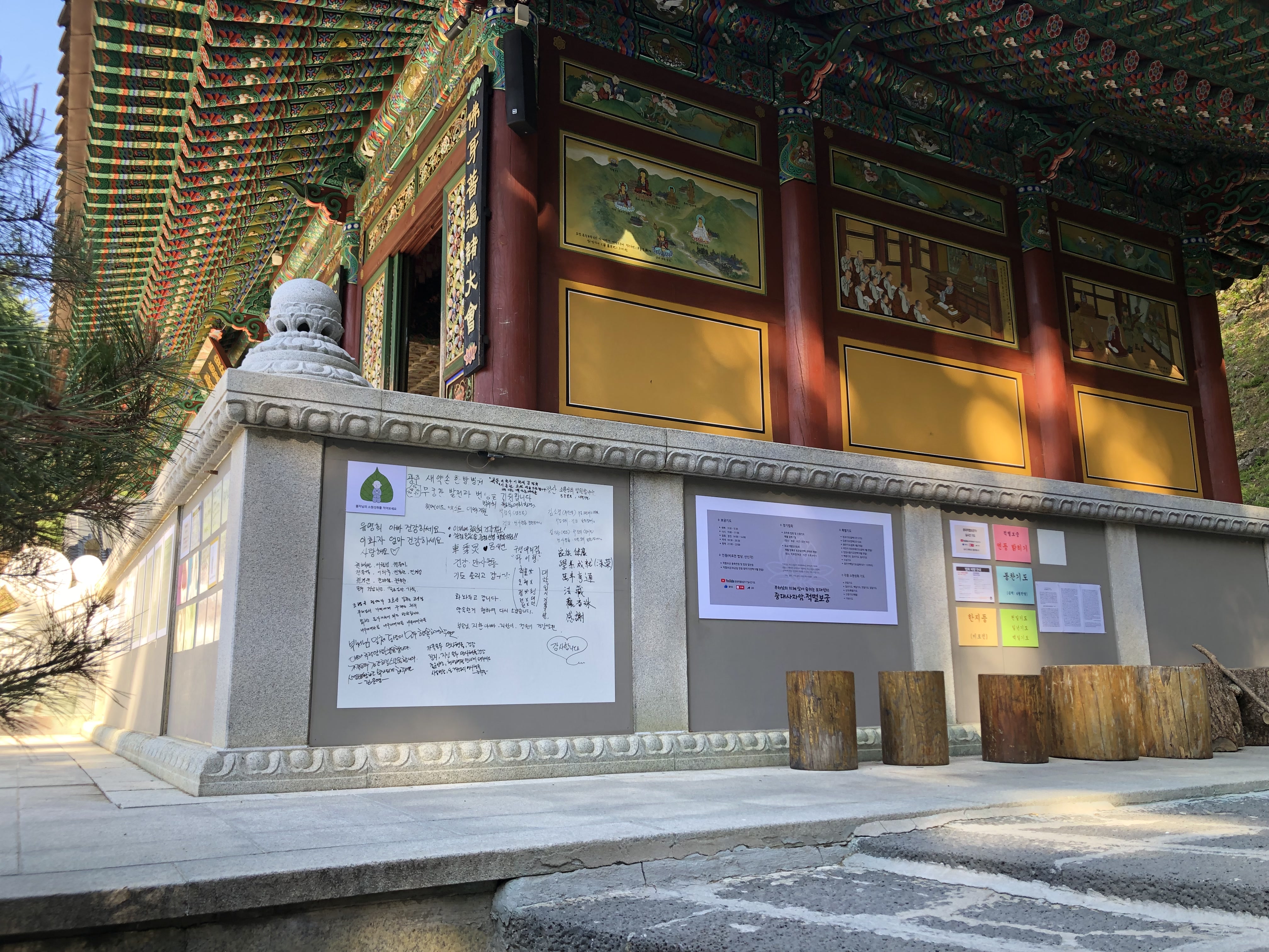 사찰을 받치는 석축기단의 벽면에 이런저런 메시지가 붙어있다.