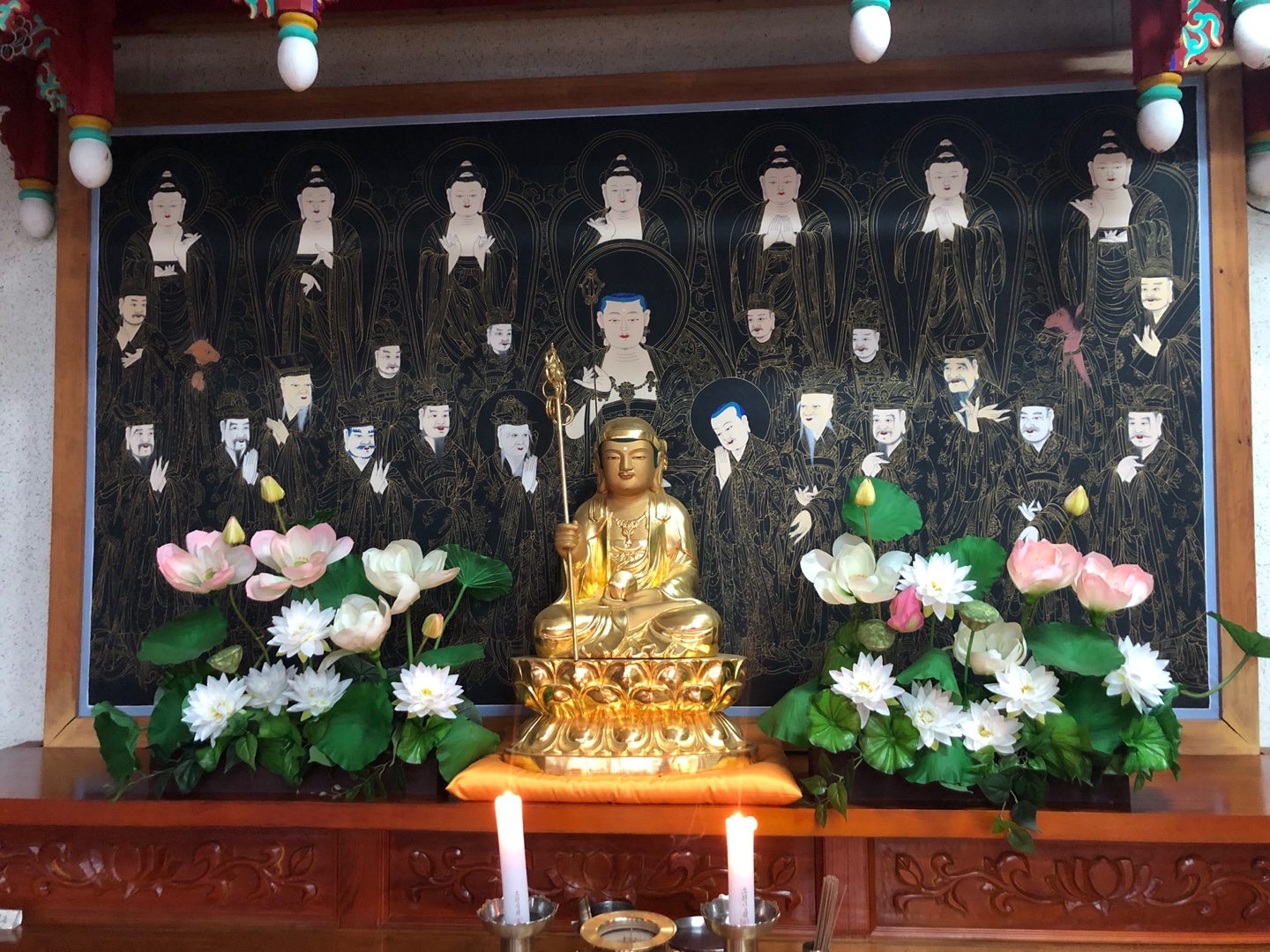 처음지장보살지장보살님을 참배한다.3층에서 하는 예불소리가 이곳으로 들린다. 화엄성중, 신중탱화오른쪽 벽에는 신장님들이 모셔져 있다. 3층에서 예불을 하고 있으시다.그 소리가 끊어지
