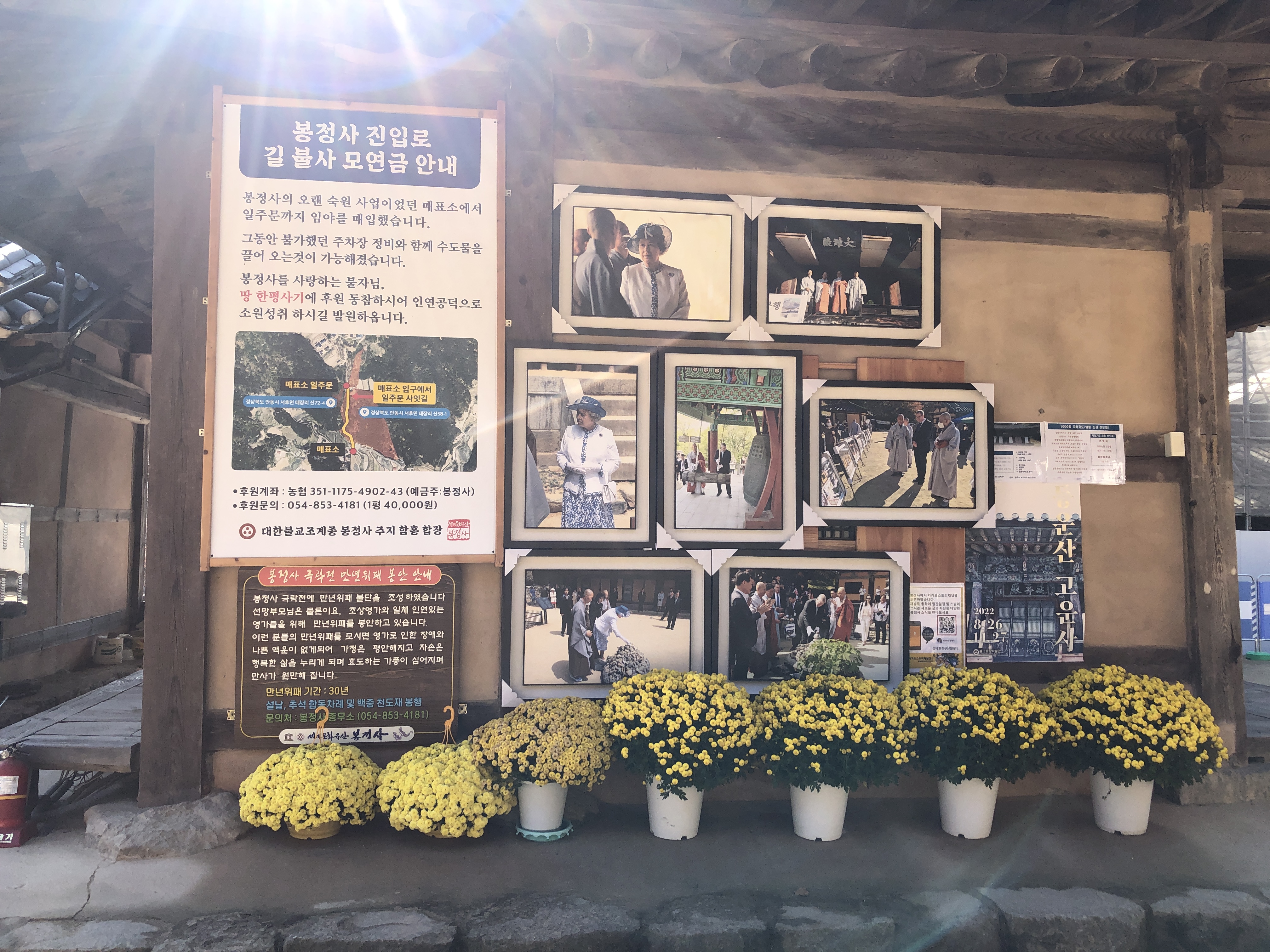 엘리자베스 여왕의 방문을 기리는 사진액자와 사찰의 홍보문구가 보인다.