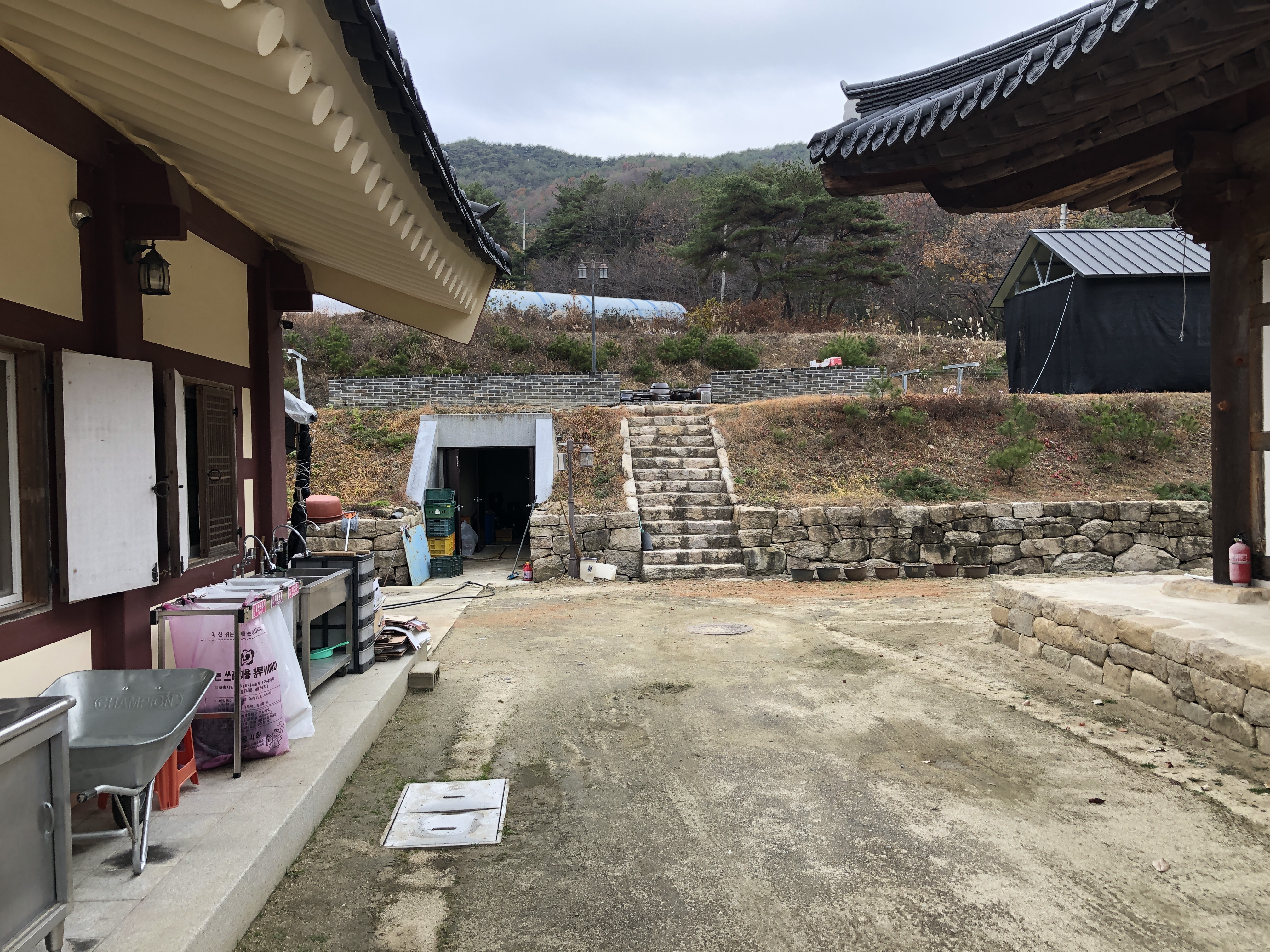 공양간과 템플스테이 건물 사이 뒤편을 보니 항아리들과 콘크리트 창고가 보인다.