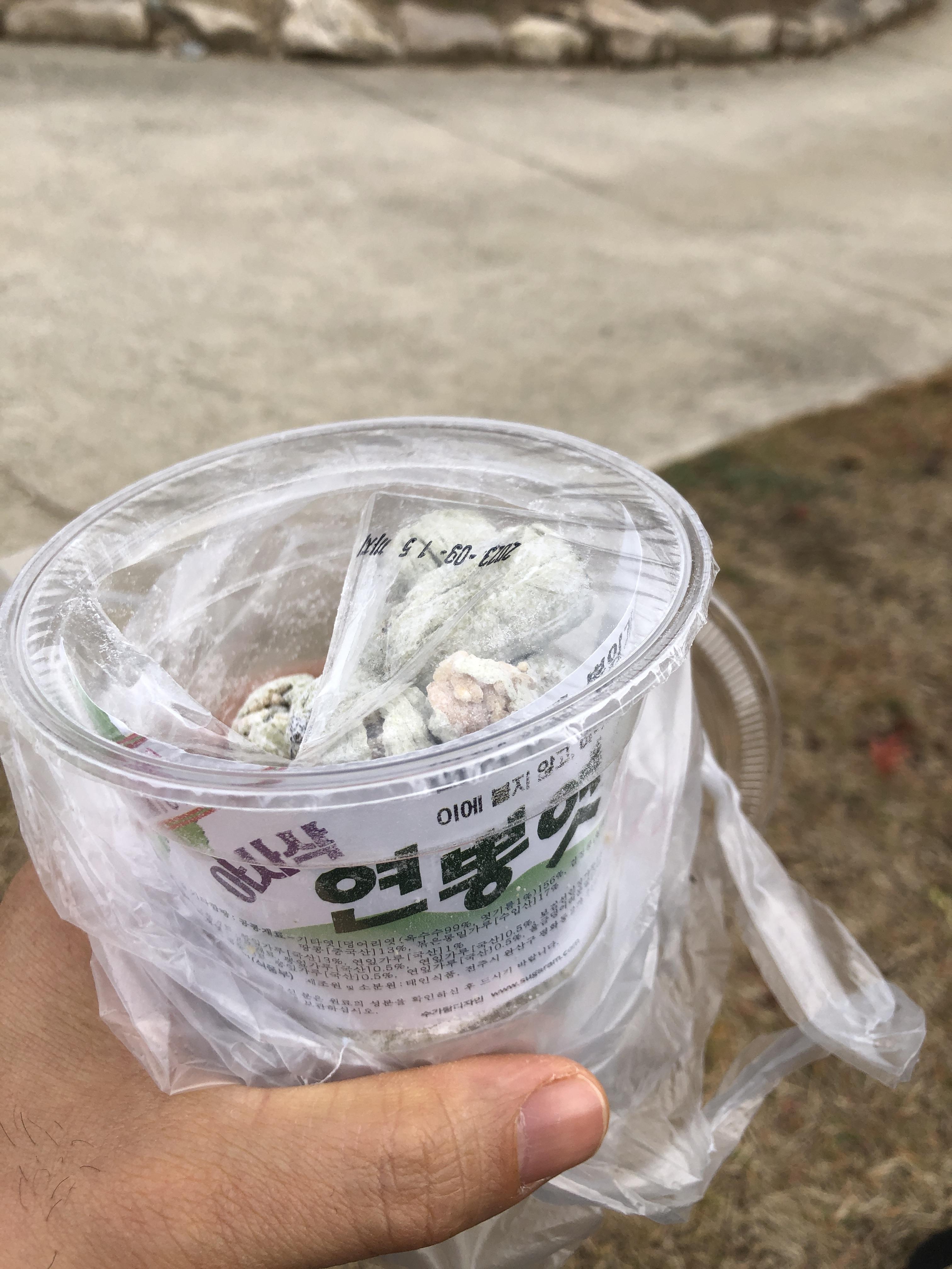 배고픔에 공양물 판매소에서 구매한 연뽕엿과 약밥을 먹고 허기를 달래려 한다.