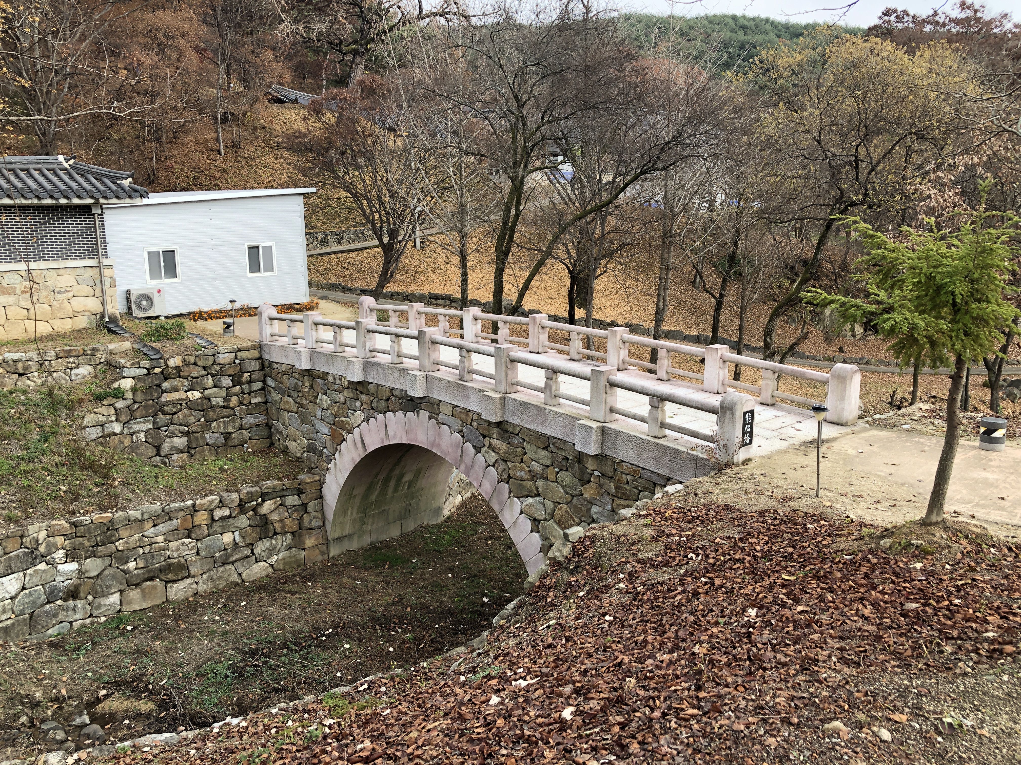 다른 곳의 돌다리를 건너다보면 심한 아치형인 경우가 있는데, 이 다리는 그것의 정도가 덜하다.