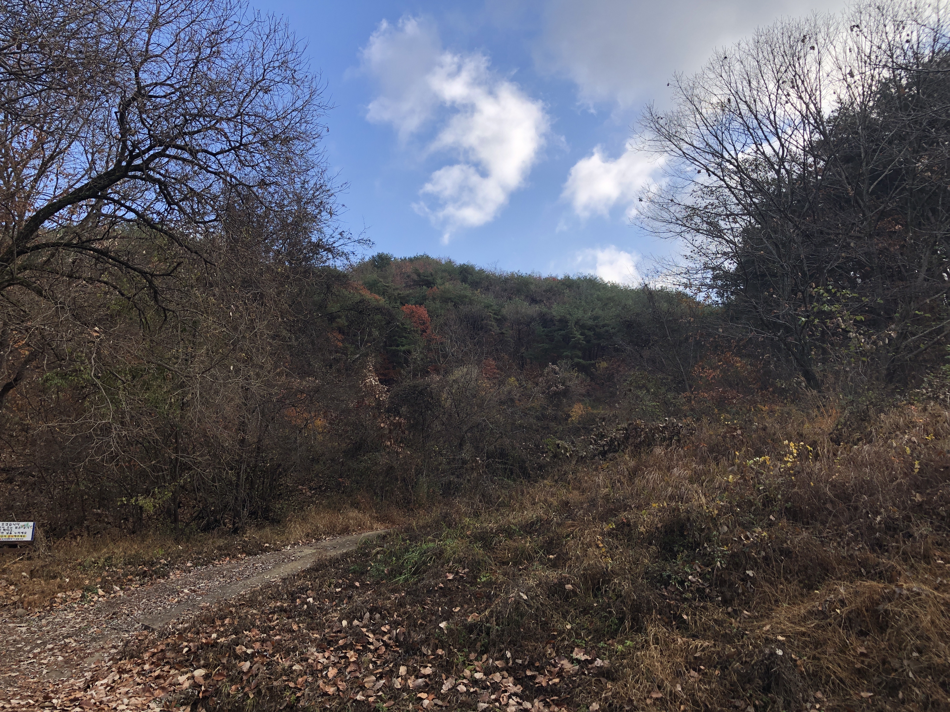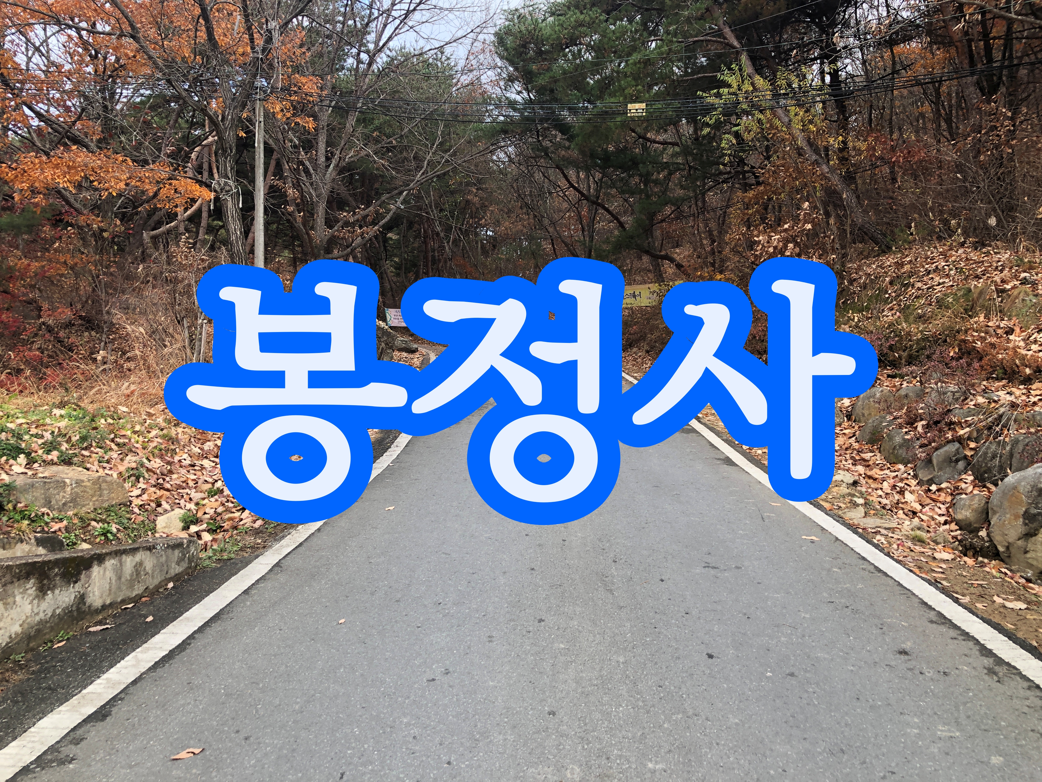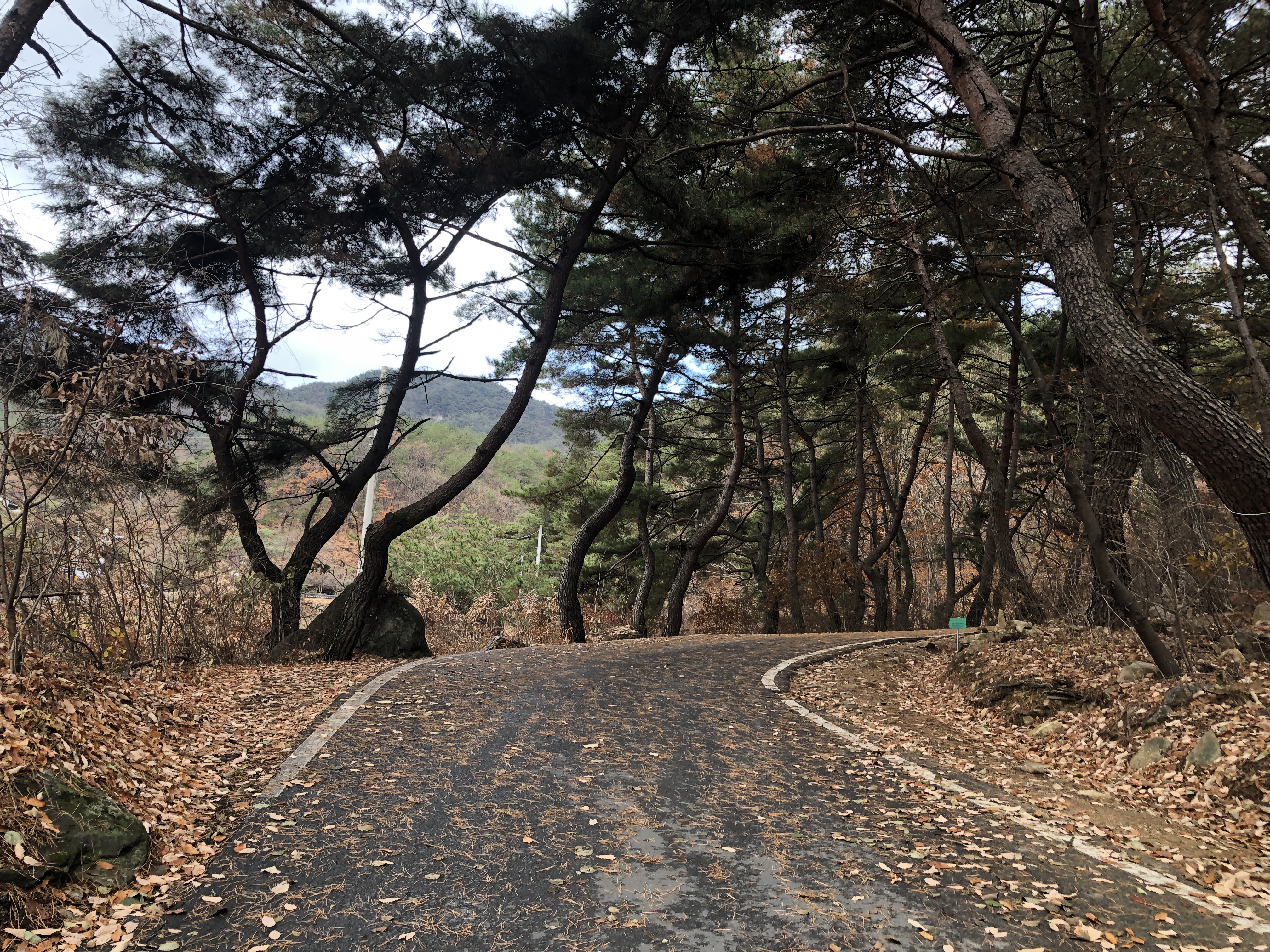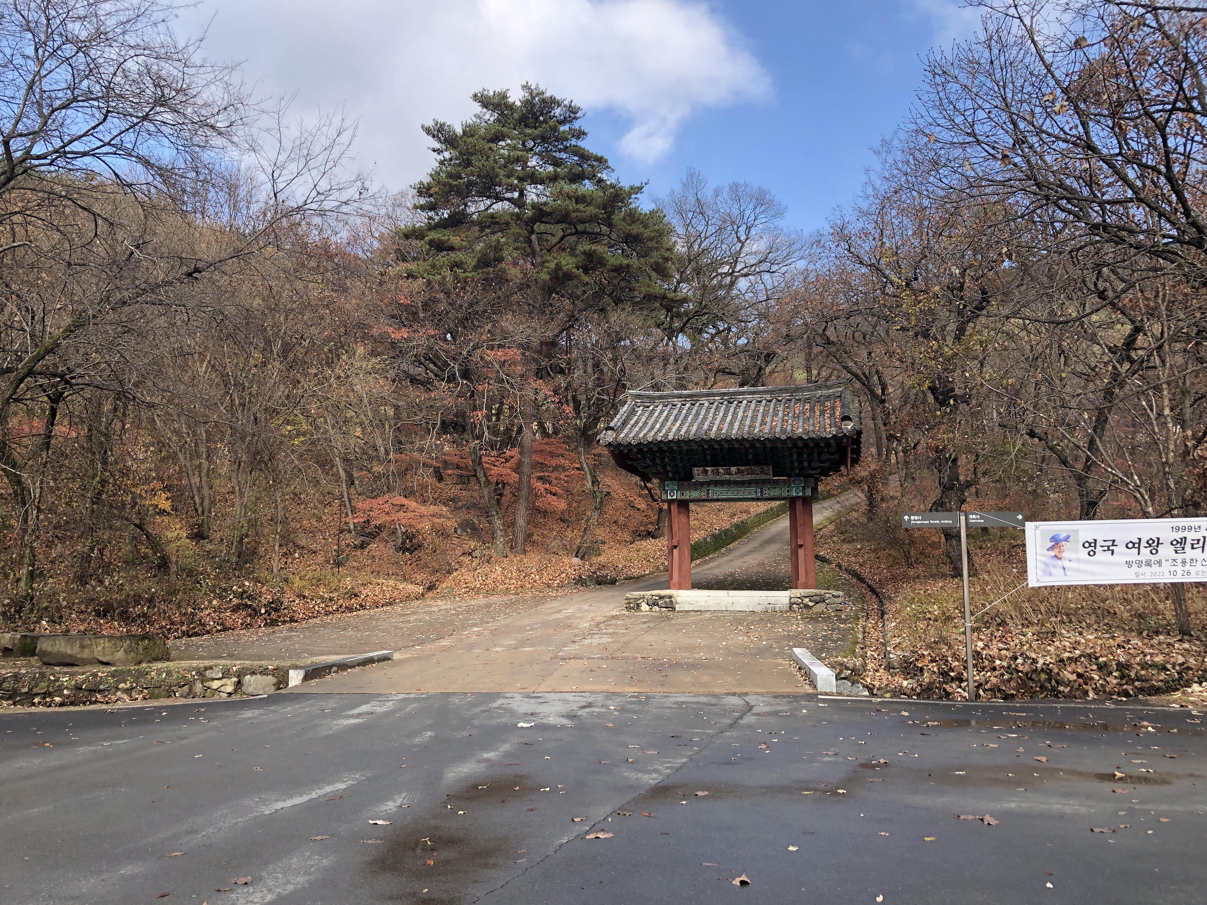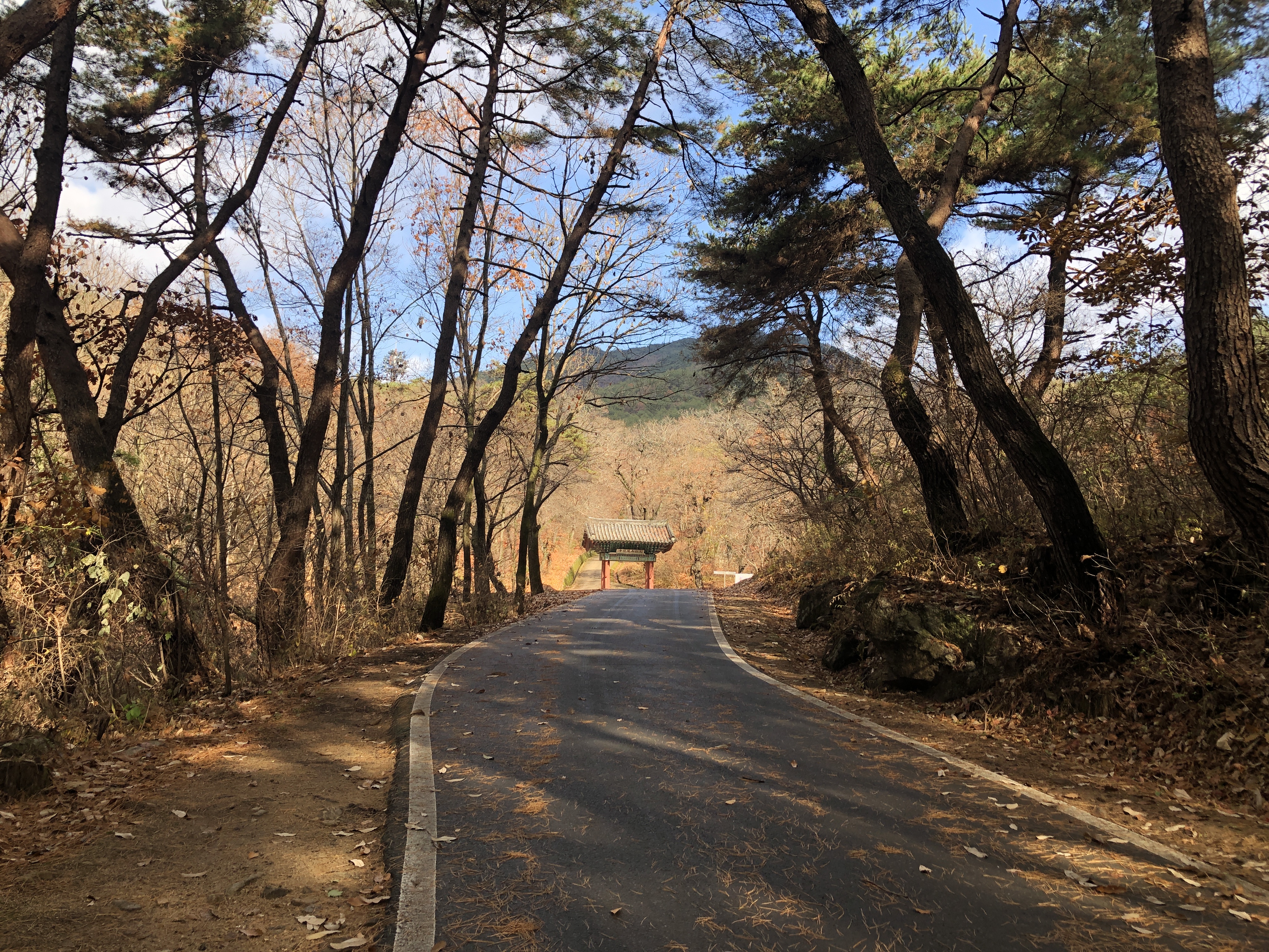 좁은 길과 뻗은 나무, 가을과 산, 일주문.