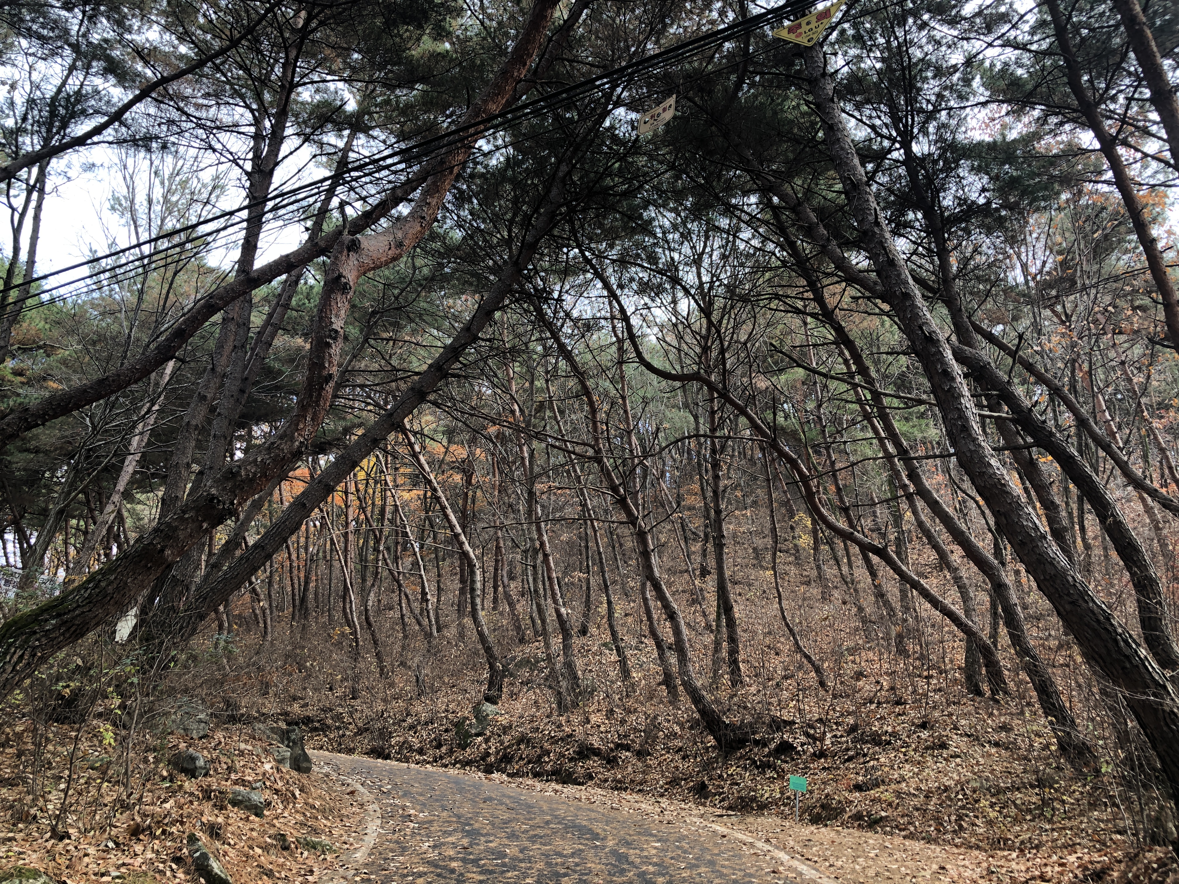 커다란 소나무가 하나같이 길로 자빠지려고 한다.