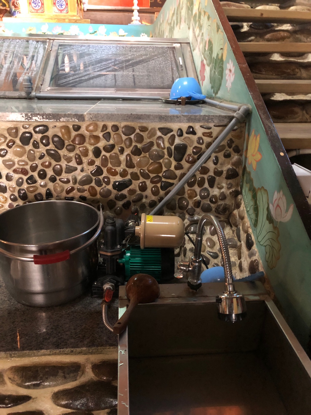 제단의 오른쪽에 수도꼭지가 있다.