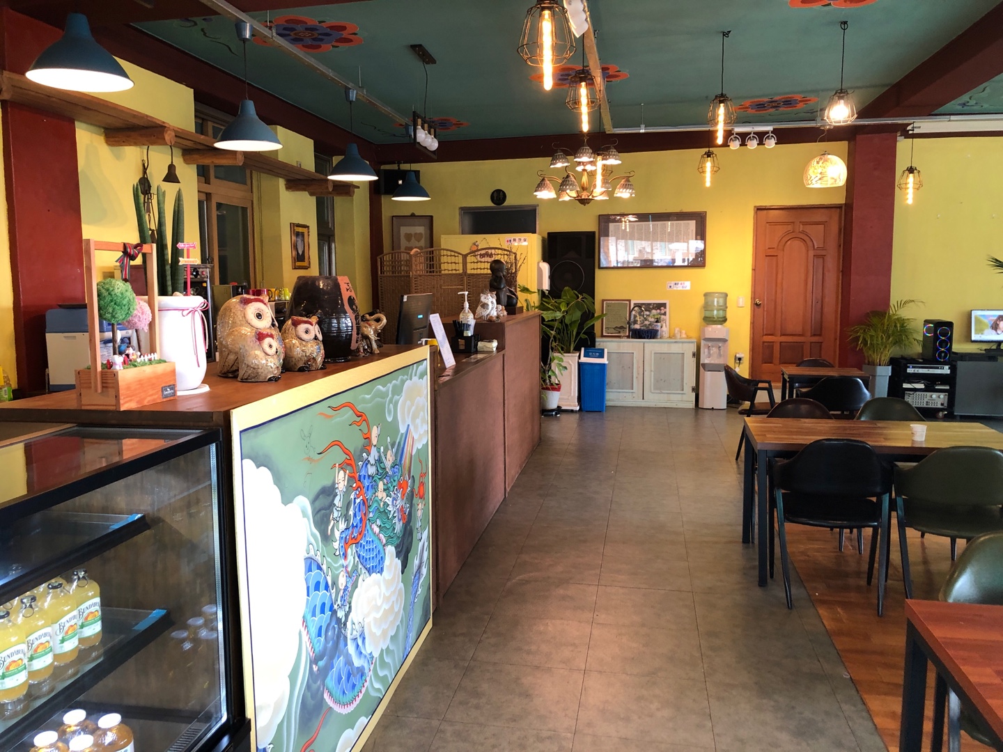 카페 안의 음악이 주변 분위기와 잘 어울린다.