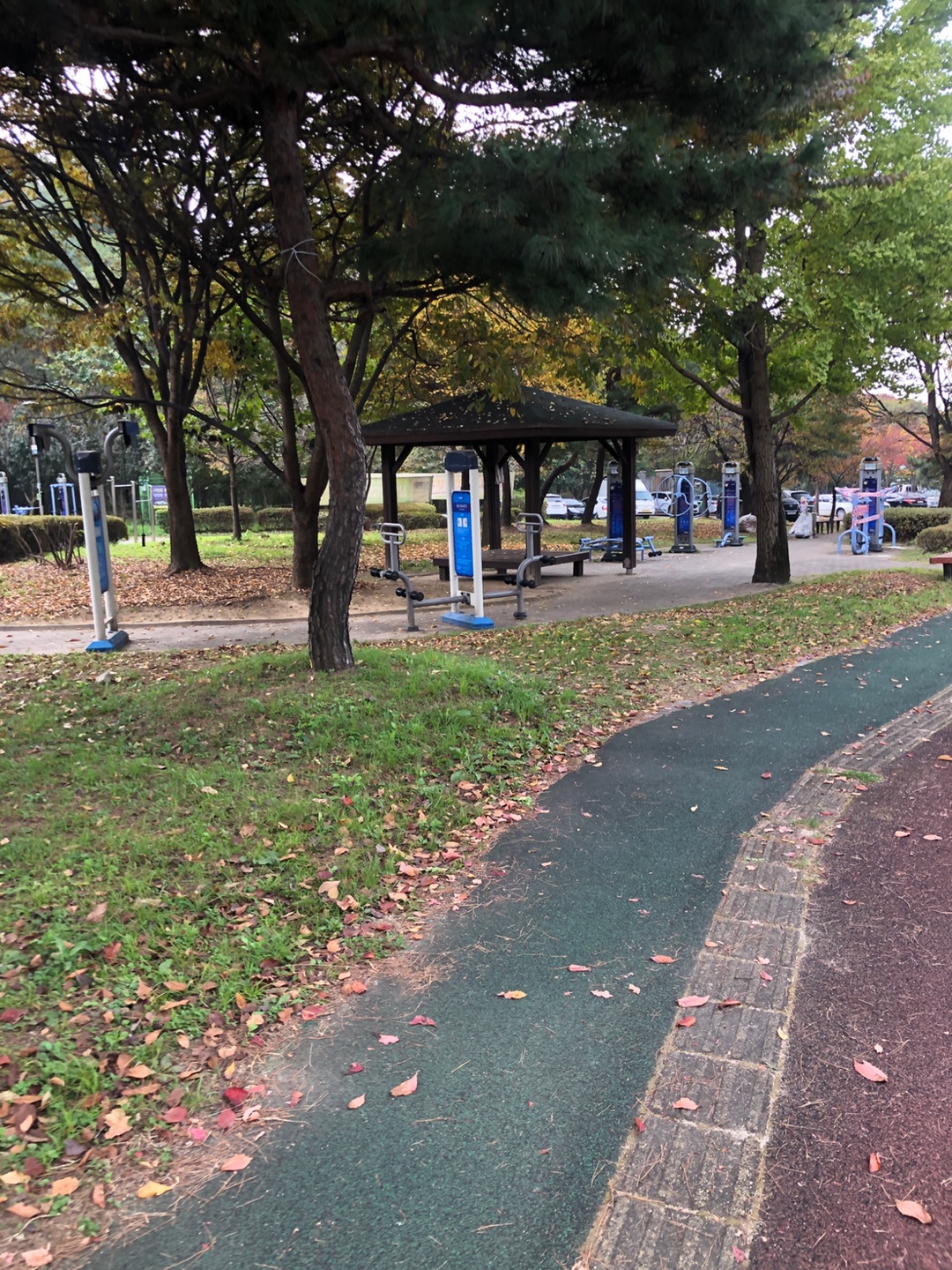 이동 중에 저 멀리 주차장과 가까이 정자, 잘 꾸며진 조경수들이 보인다.