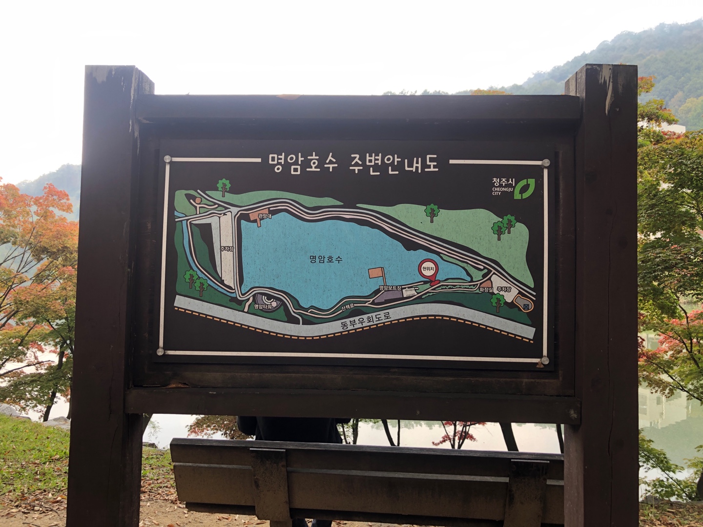 안내도 뒤편 벤치에 앉아있는 사람은 호수를 보며 무엇을 느끼고 있을까?