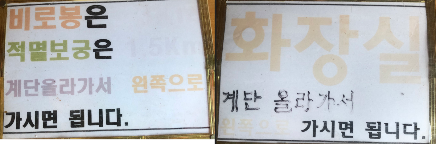 사찰을 다 둘러보고 다음날 중대 사자암의 적멸보궁을 참배하러 가면서 저 게시판의 존재를 알고 건물배치도를 발견했으니 이상하다 여겼다.