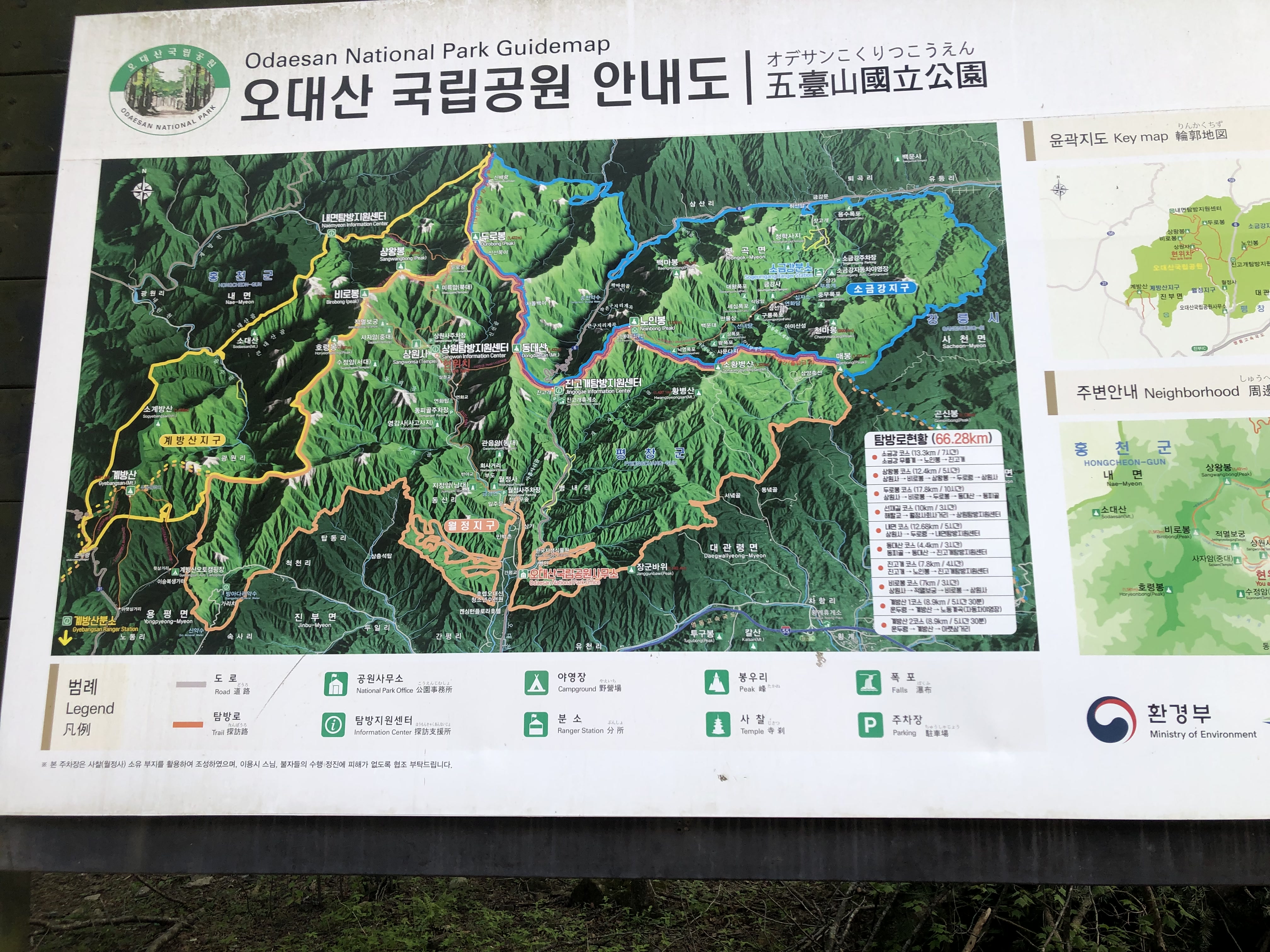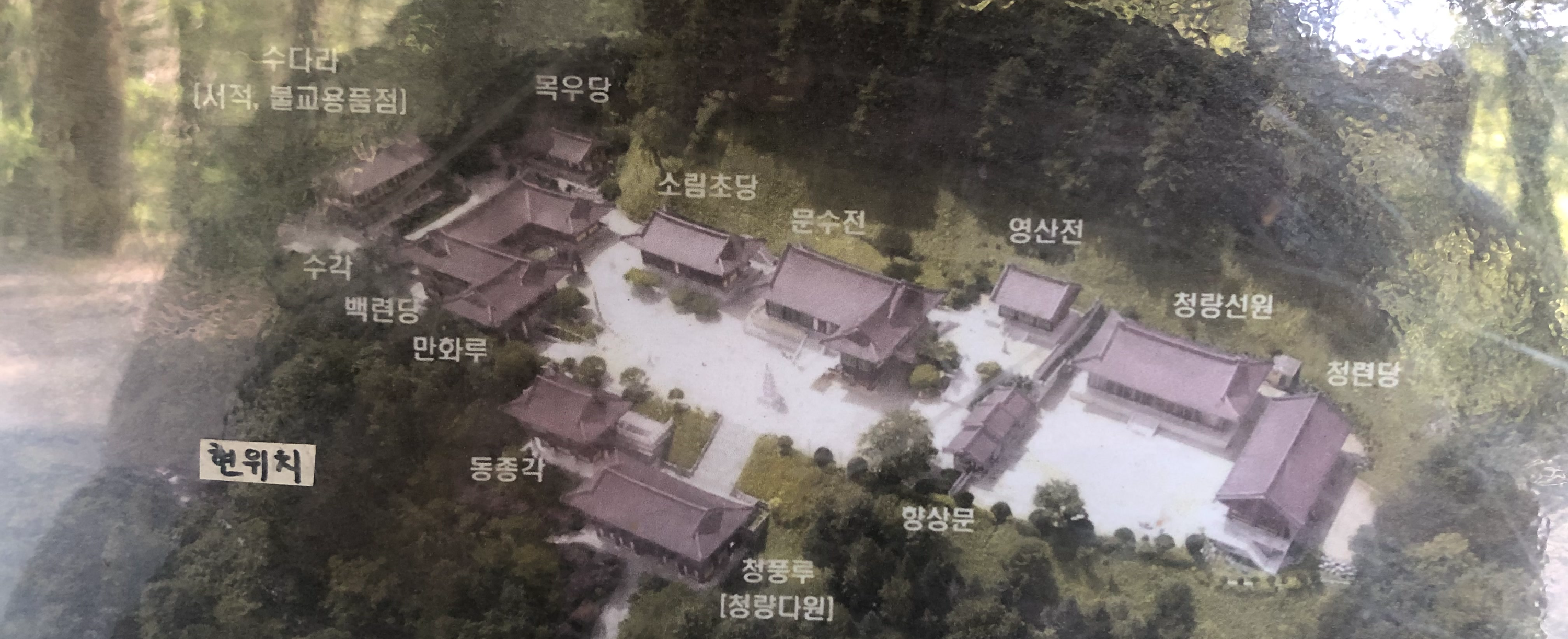 사찰을 다 둘러보고 다음날 중대 사자암의 적멸보궁을 참배하러 가면서 저 게시판의 존재를 알고 건물배치도를 발견했으니 이상하다 여겼다.