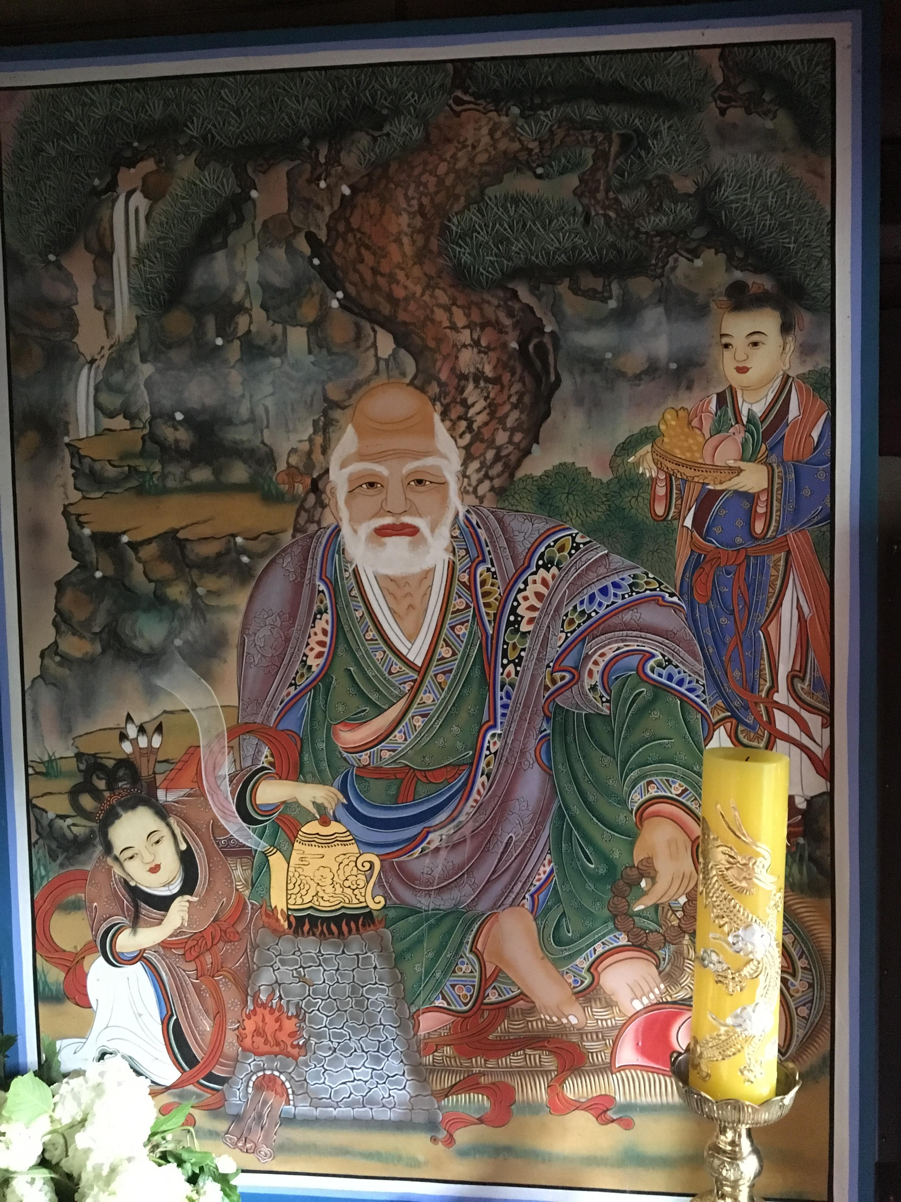 소나무 아래 염주를 들고 앉아계시고, 선녀님이 차를 끓이며 복숭아를 들고 오는듯한 모습이다.