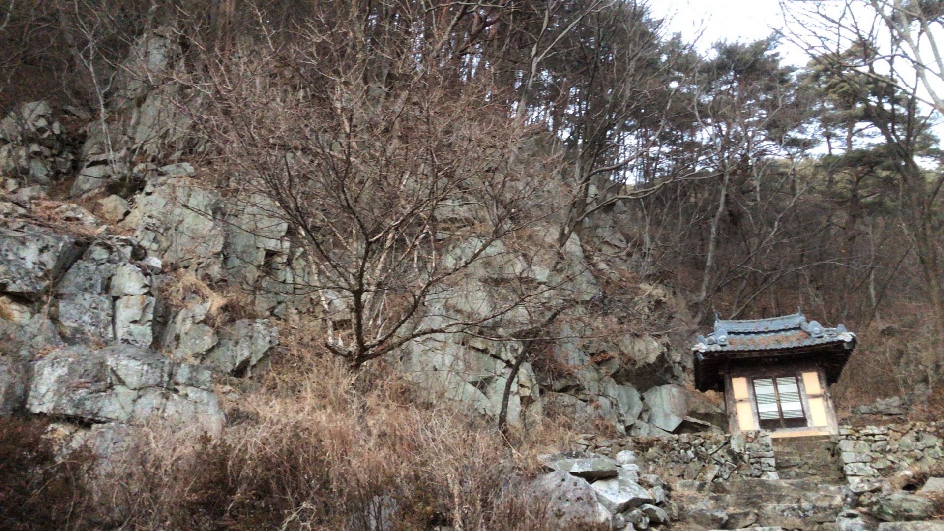 깎아지른 암벽 아래로 산신각이 자리하고 있다.